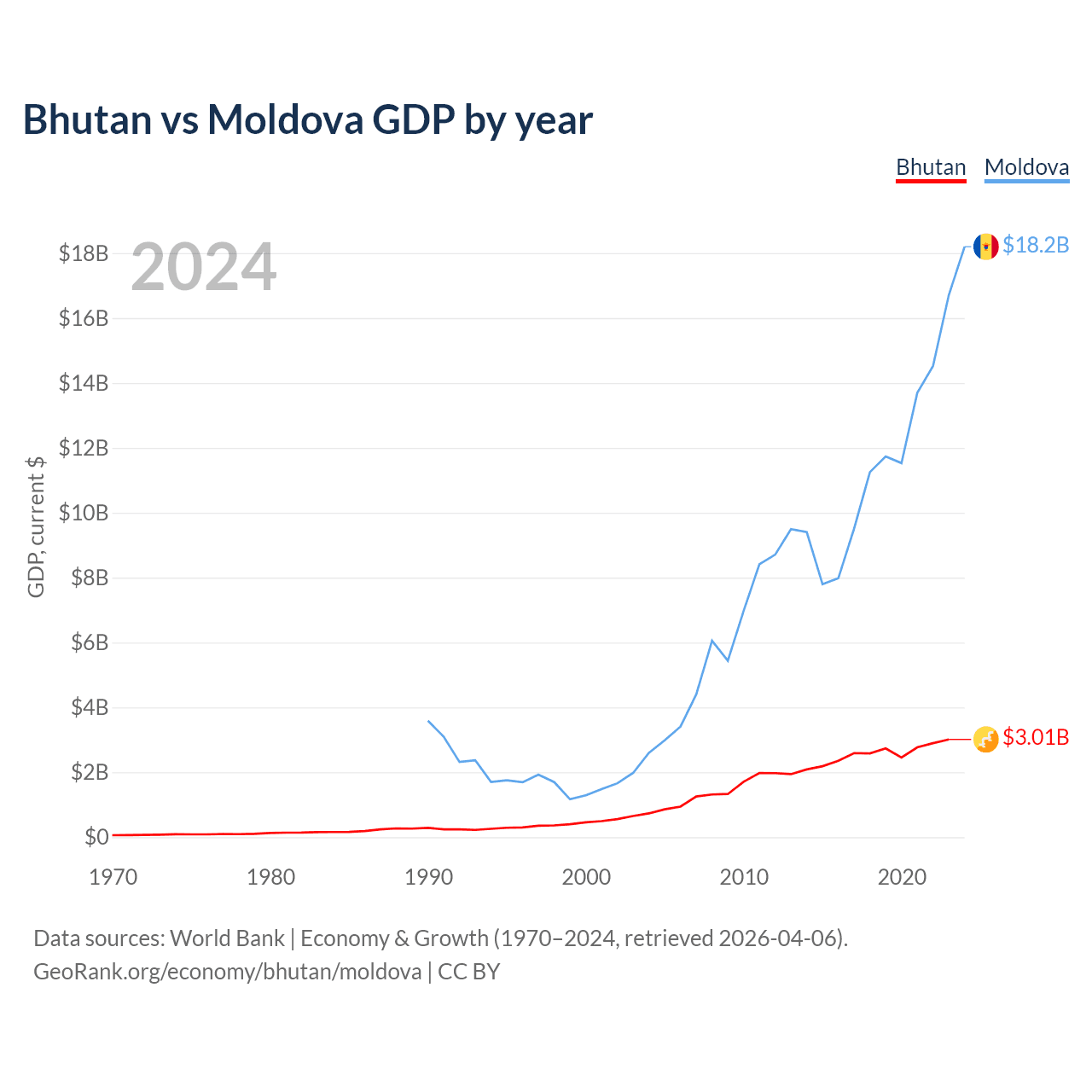 Bhutan has a GDP of $3.01B compared to $18.2B for Moldova, ranking 170/197 and 134/197 by economy size, respectively.