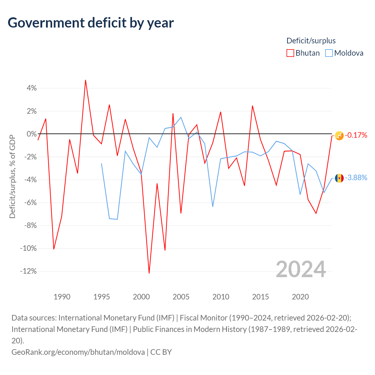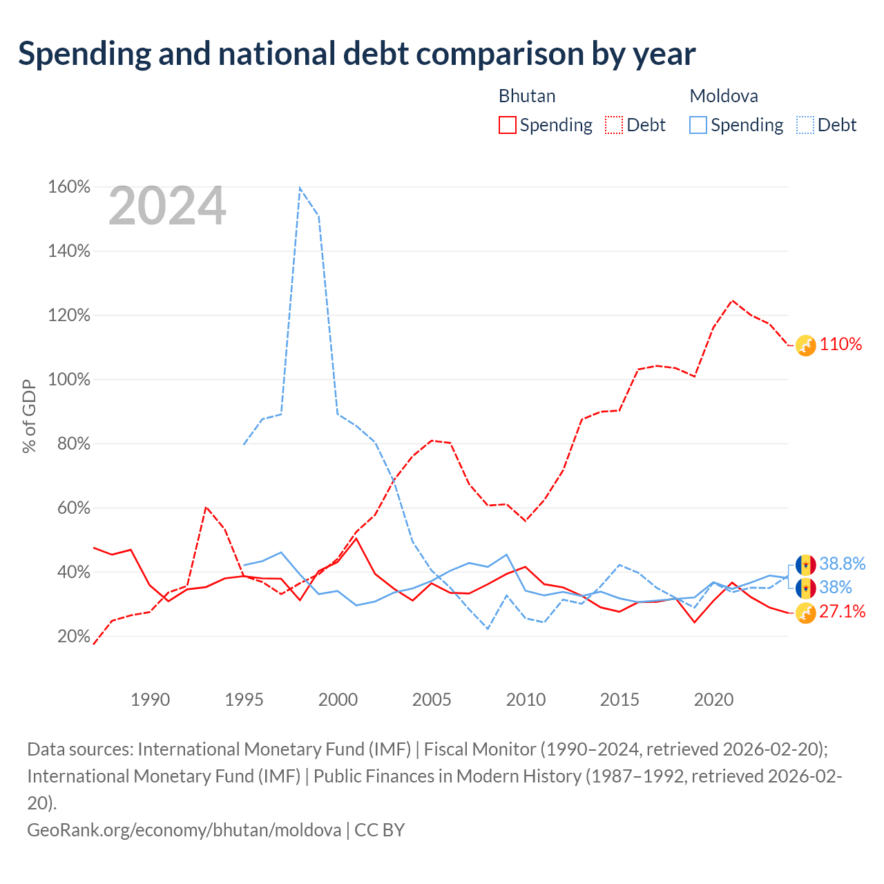 Bhutan has $3.53B in government debt (110.4% of GDP), compared to $7.06B (38.8% of GDP) in Moldova.