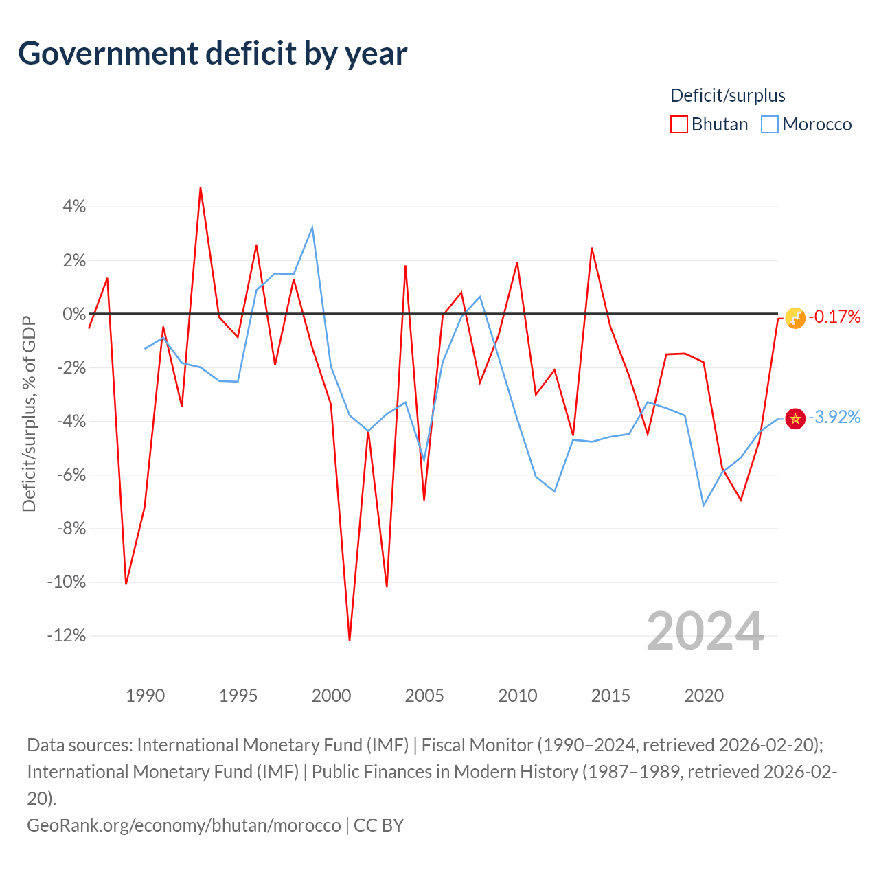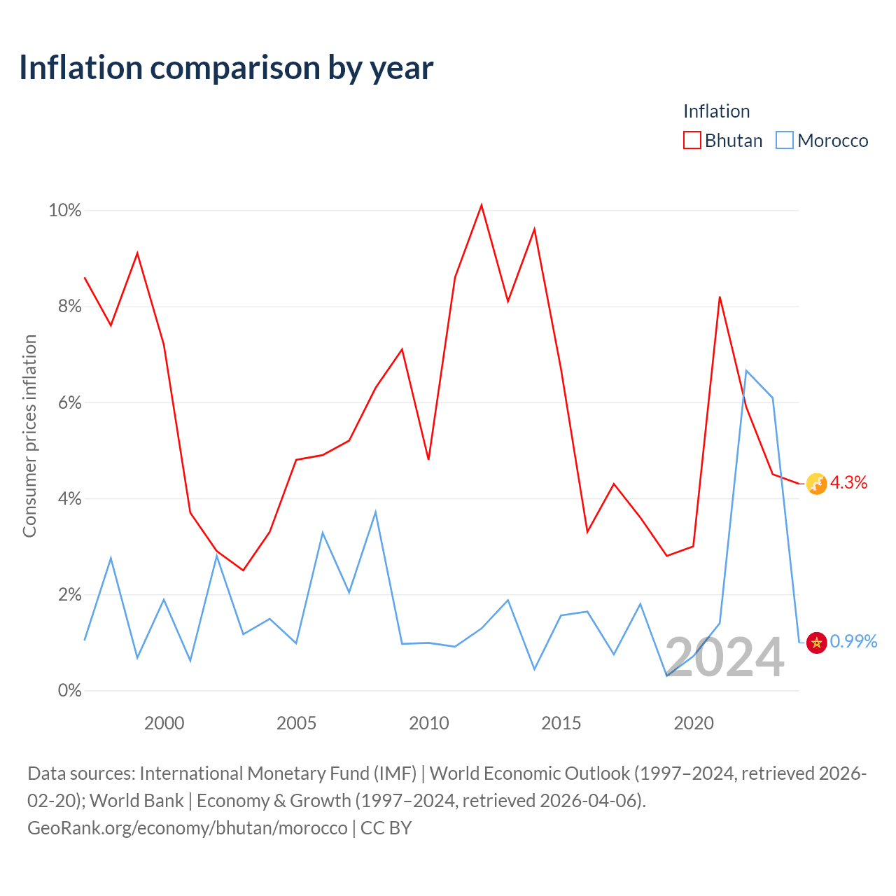 Bhutan has a GDP of $3.01B compared to $161B for Morocco, ranking 170/197 and 58/197 by economy size, respectively.