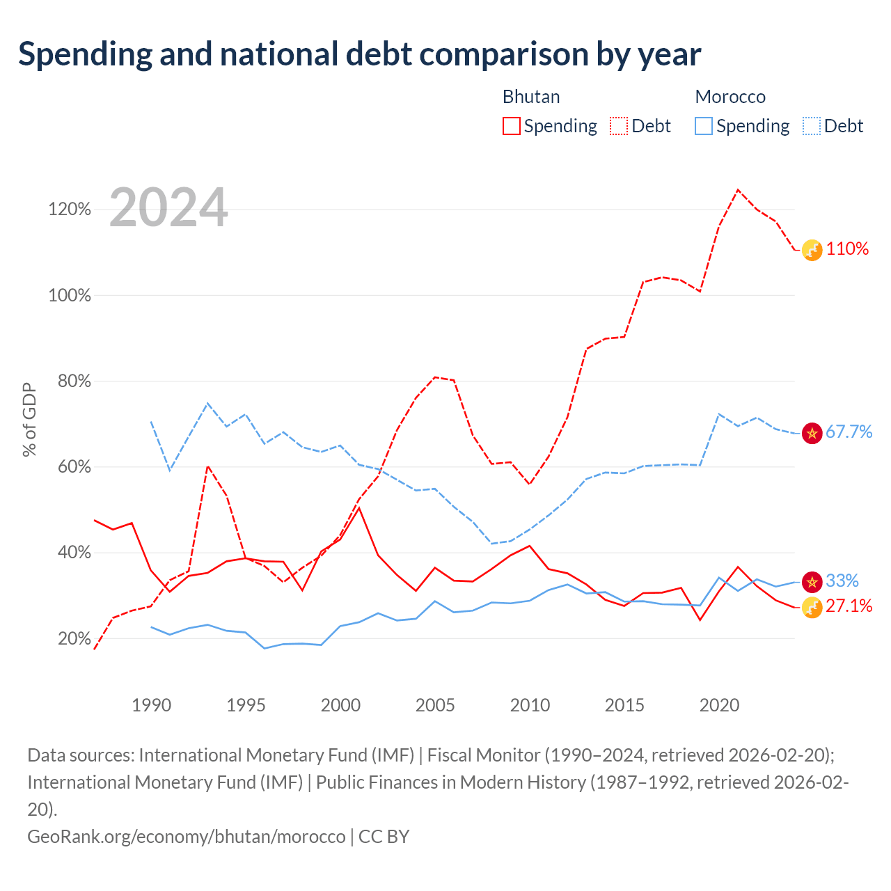 Bhutan has $3.53B in government debt (110.4% of GDP), compared to $109B (67.7% of GDP) in Morocco.