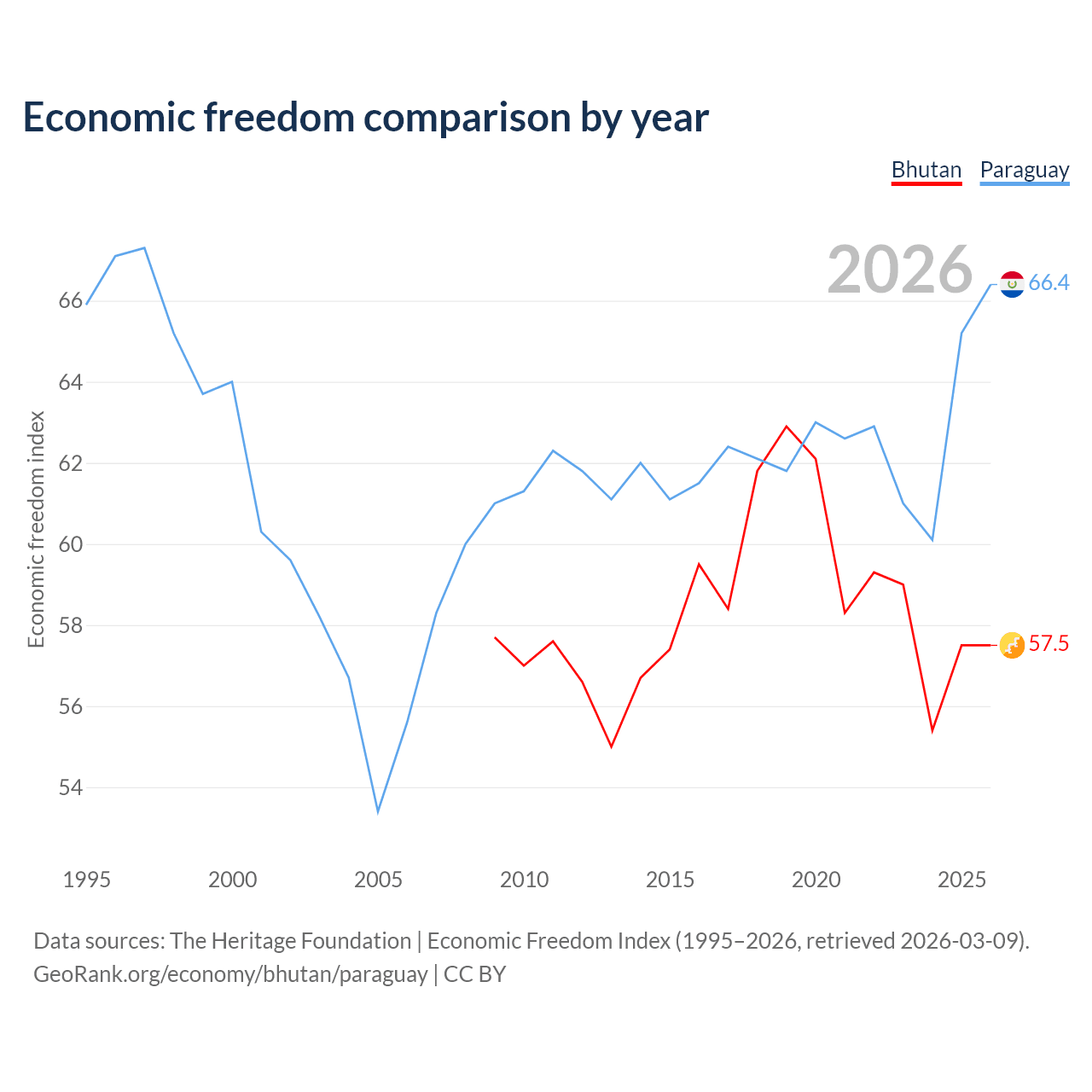 Data sources: The Heritage Foundation | Economic Freedom Index (1995–2026, retrieved 2026-03-09).
