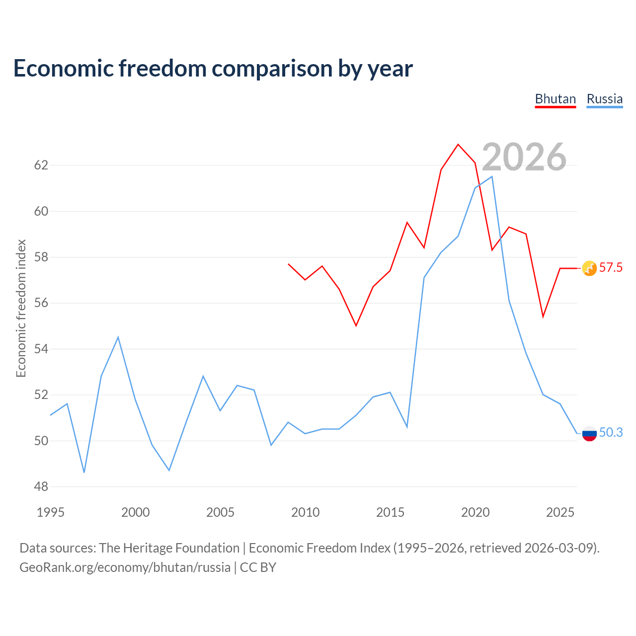The Economic Freedom Index for Bhutan is 57.5, ranking 115/197, compared to 50.3 for Russia, ranking 161/197. The chart above displays a comparison of annual changes in economic freedom indexes.