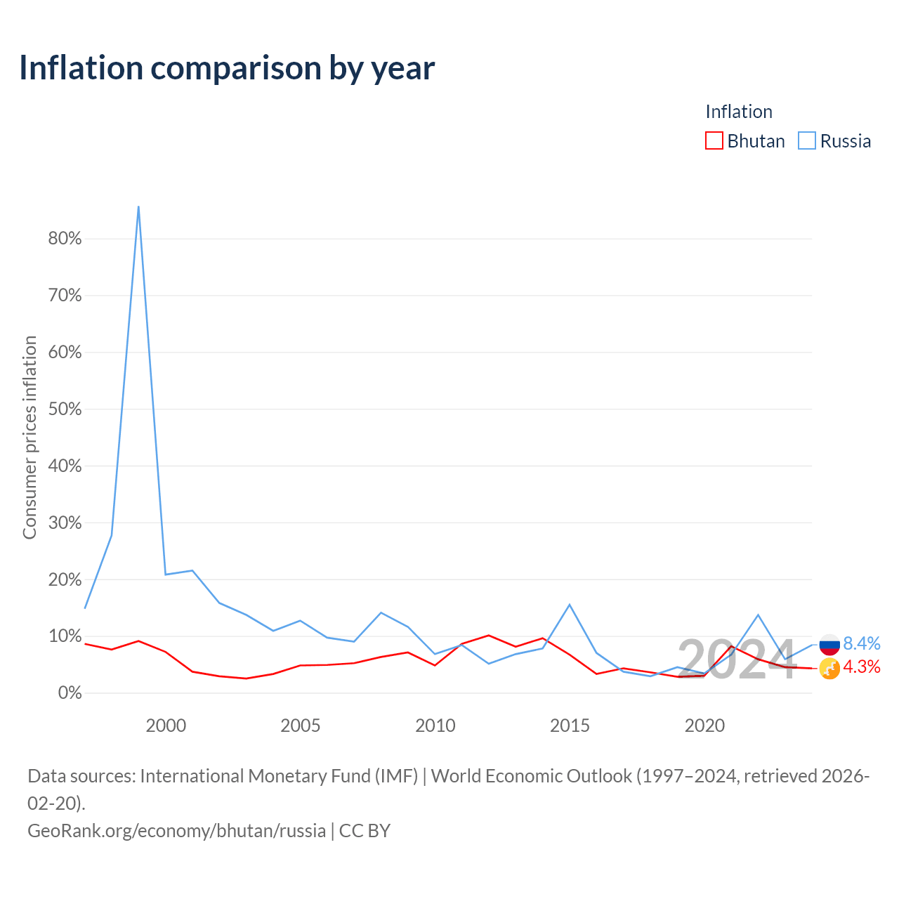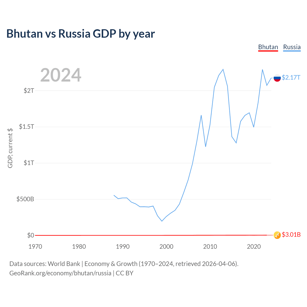 Bhutan has a GDP of $3.01B compared to $2.17T for Russia, ranking 170/197 and 11/197 by economy size, respectively.