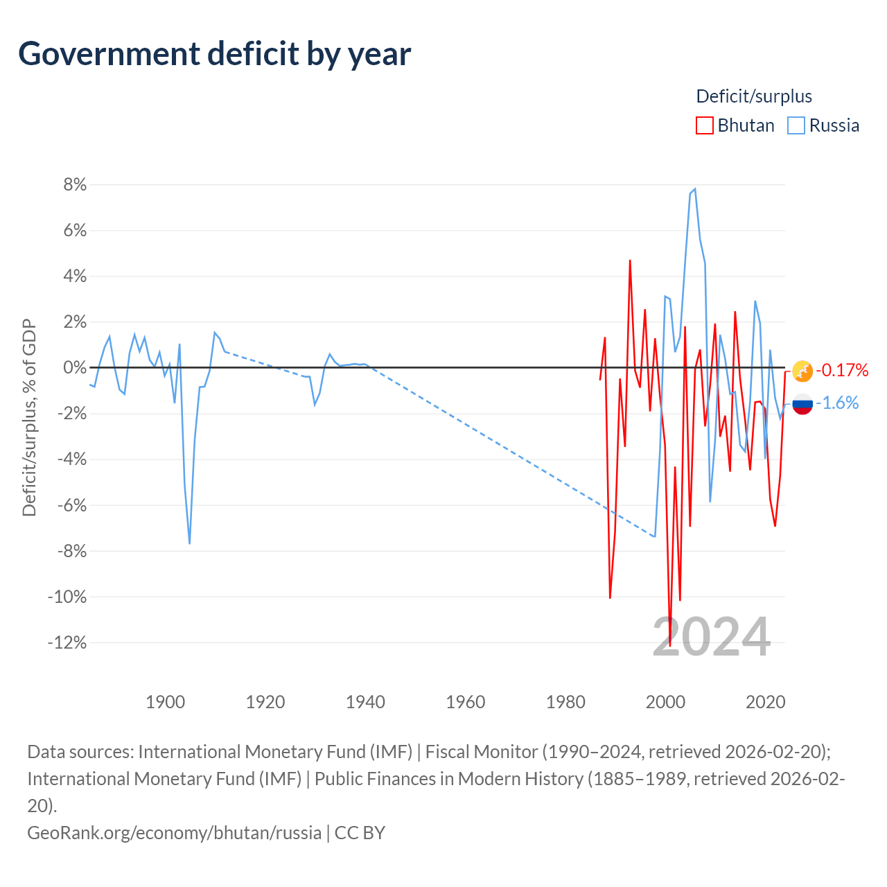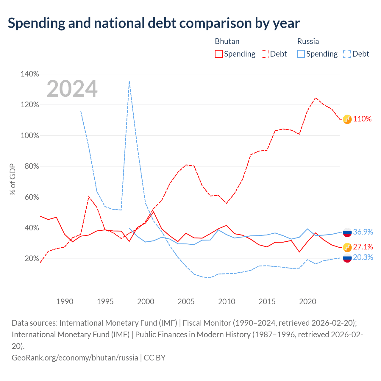 Bhutan has $3.53B in government debt (110.4% of GDP), compared to $440B (20.3% of GDP) in Russia.