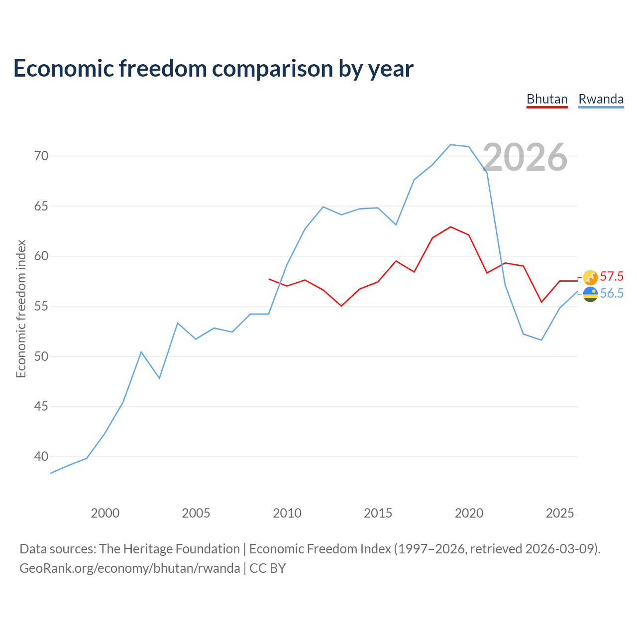 The Economic Freedom Index for Bhutan is 57.5, ranking 115/197, compared to 56.5 for Rwanda, ranking 121/197. The chart above displays a comparison of annual changes in economic freedom indexes.