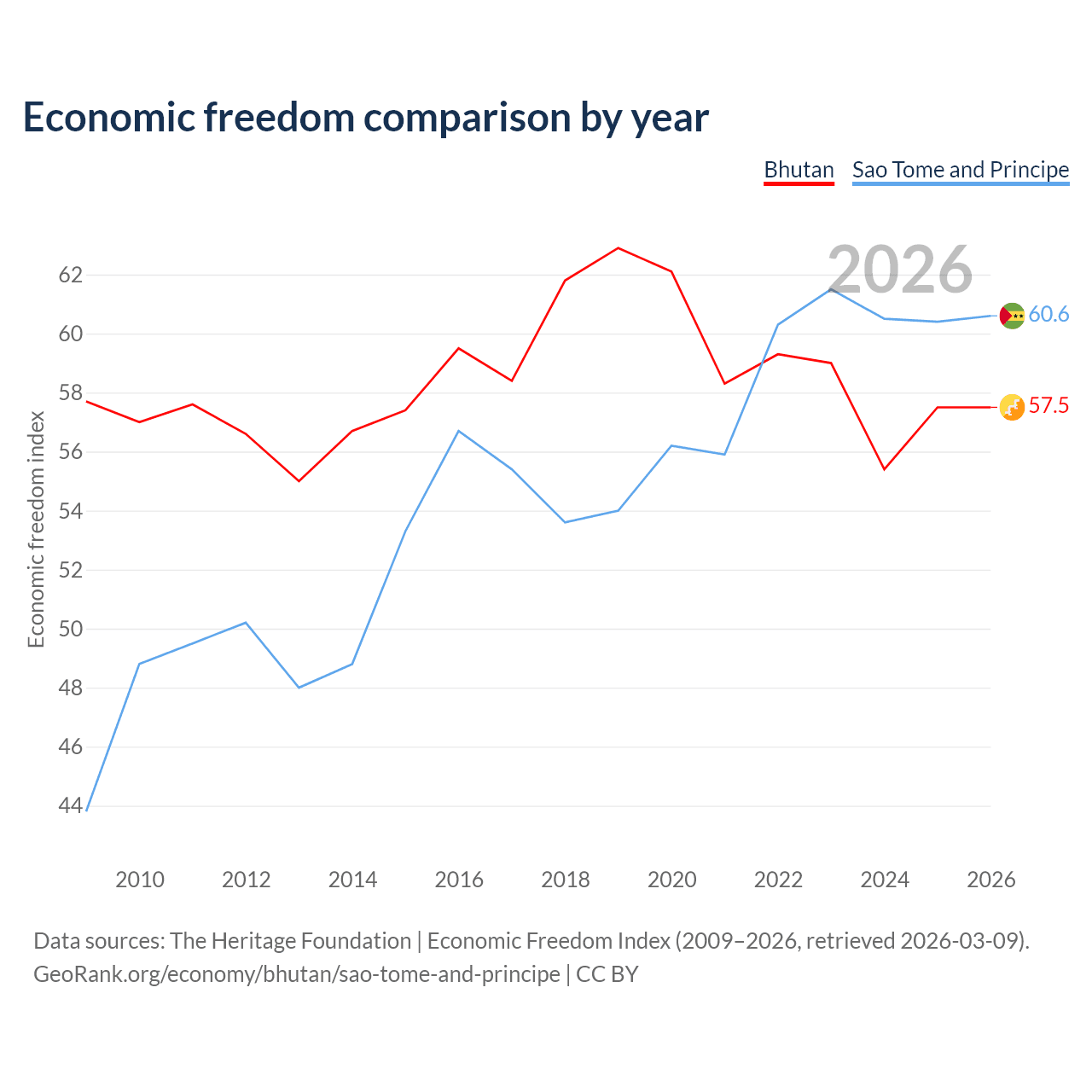 The Economic Freedom Index for Bhutan is 57.5, ranking 115/197, compared to 60.6 for Sao Tome and Principe, ranking 93/197. The chart above displays a comparison of annual changes in economic freedom indexes.