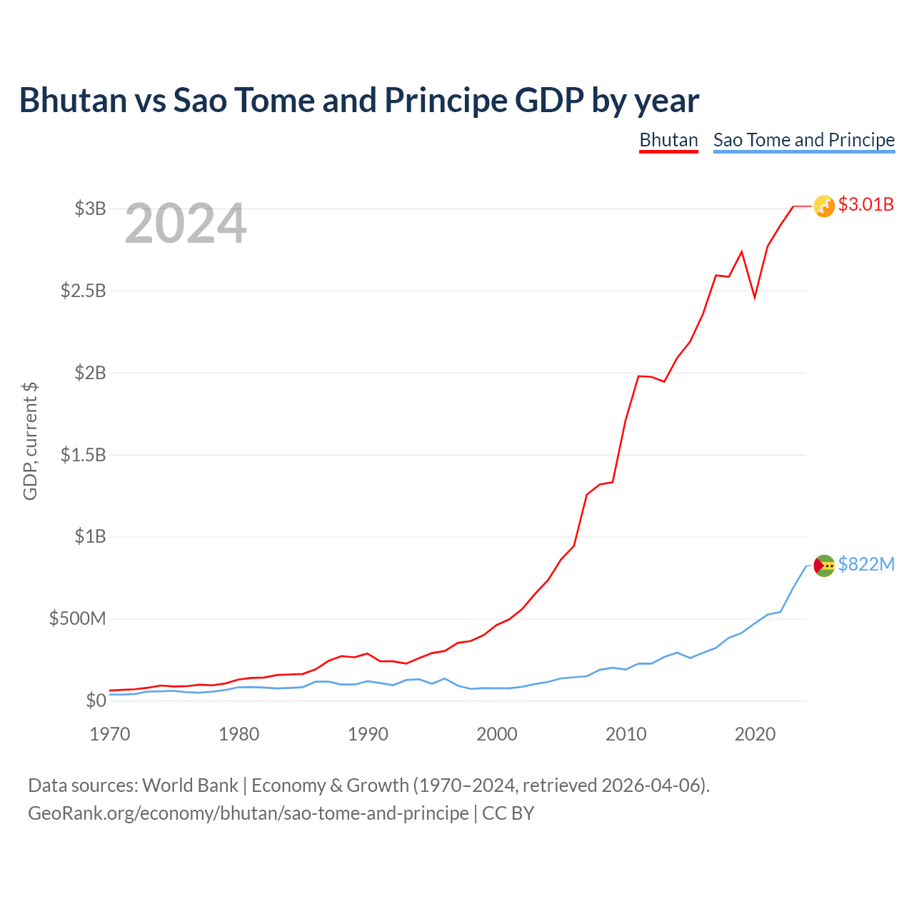 Bhutan has a GDP of $3.01B compared to $822M for Sao Tome and Principe, ranking 170/197 and 189/197 by economy size, respectively.