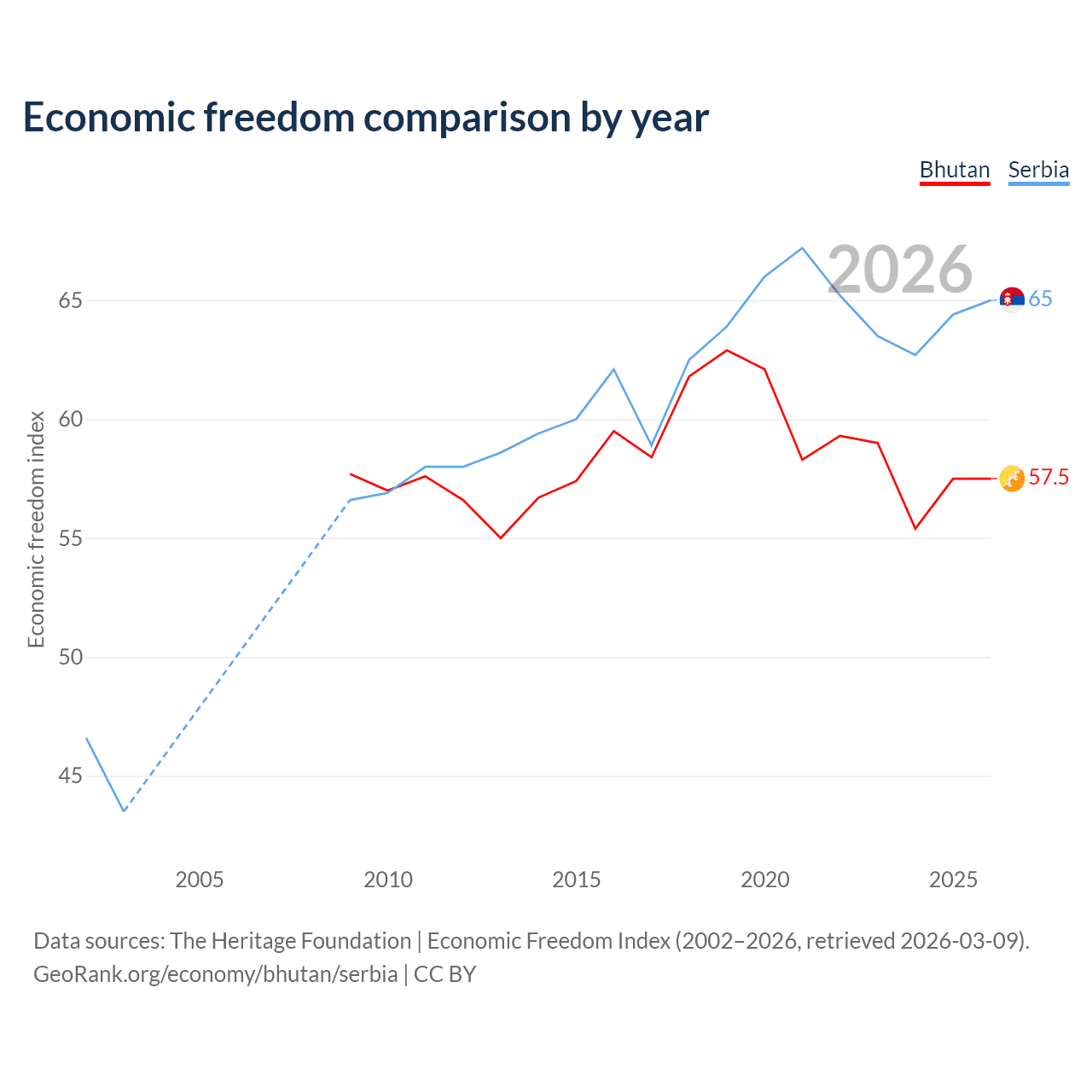 The Economic Freedom Index for Bhutan is 57.5, ranking 115/197, compared to 65 for Serbia, ranking 68/197. The chart above displays a comparison of annual changes in economic freedom indexes.