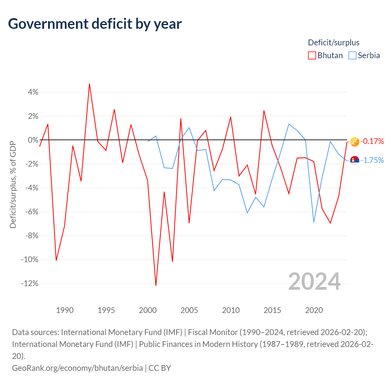 Bhutan has a GDP of $3.01B compared to $90.1B for Serbia, ranking 170/197 and 76/197 by economy size, respectively.