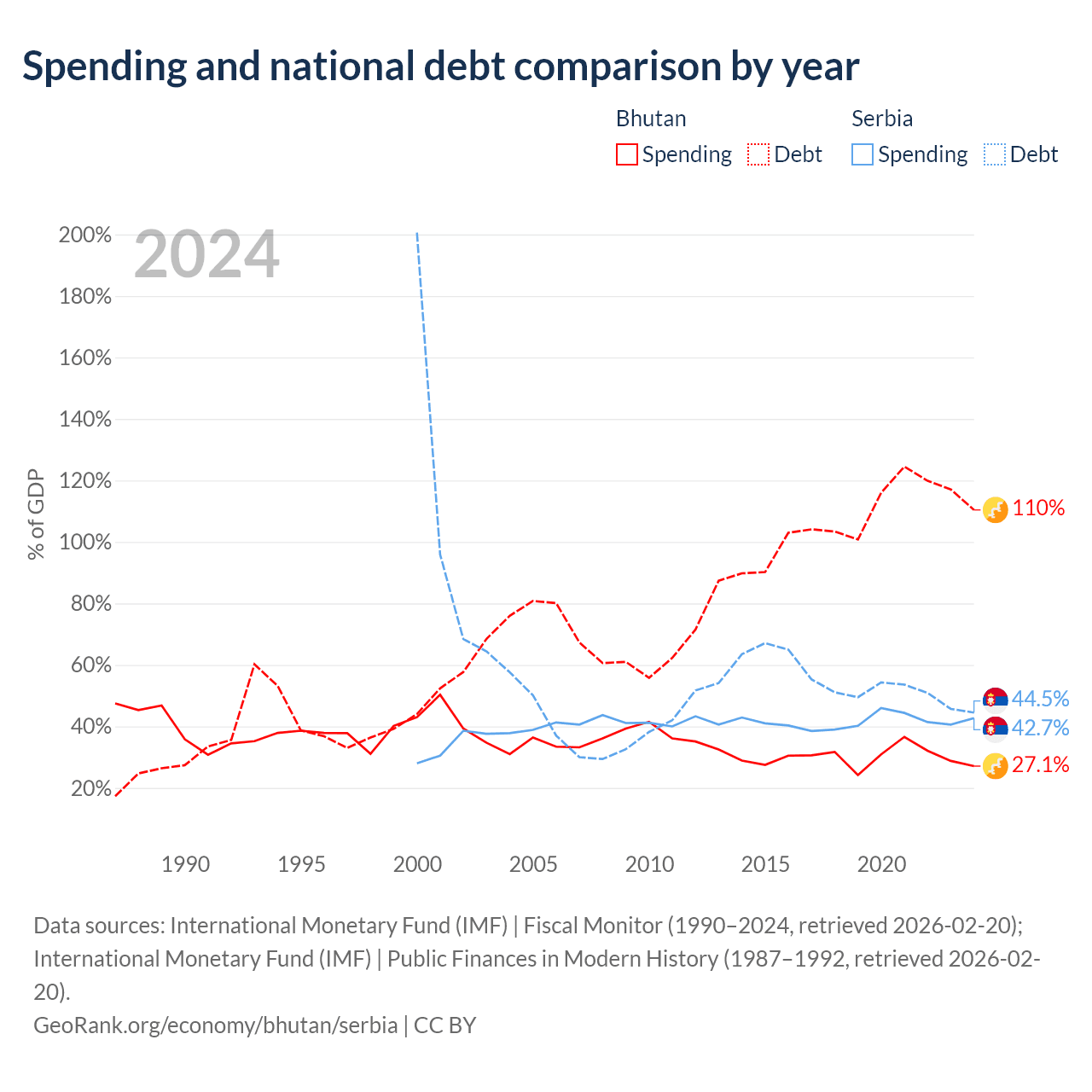 Bhutan has $3.53B in government debt (110.4% of GDP), compared to $40.1B (44.5% of GDP) in Serbia.