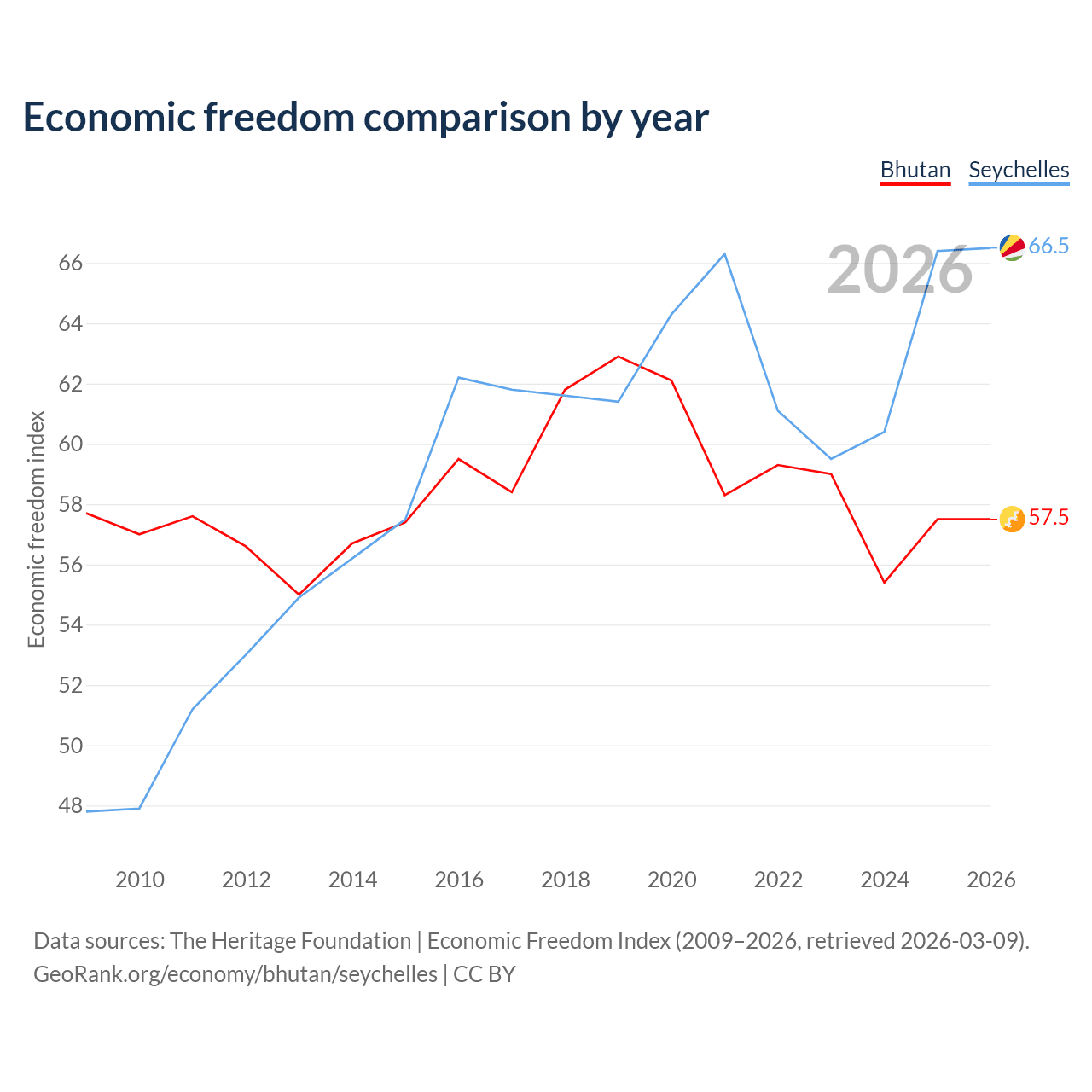 The Economic Freedom Index for Bhutan is 57.5, ranking 115/197, compared to 66.5 for the Seychelles, ranking 60/197. The chart above displays a comparison of annual changes in economic freedom indexes.