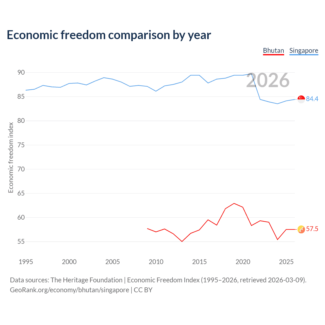 The Economic Freedom Index for Bhutan is 57.5, ranking 115/197, compared to 84.4 for Singapore, ranking 1/197. The chart above displays a comparison of annual changes in economic freedom indexes.