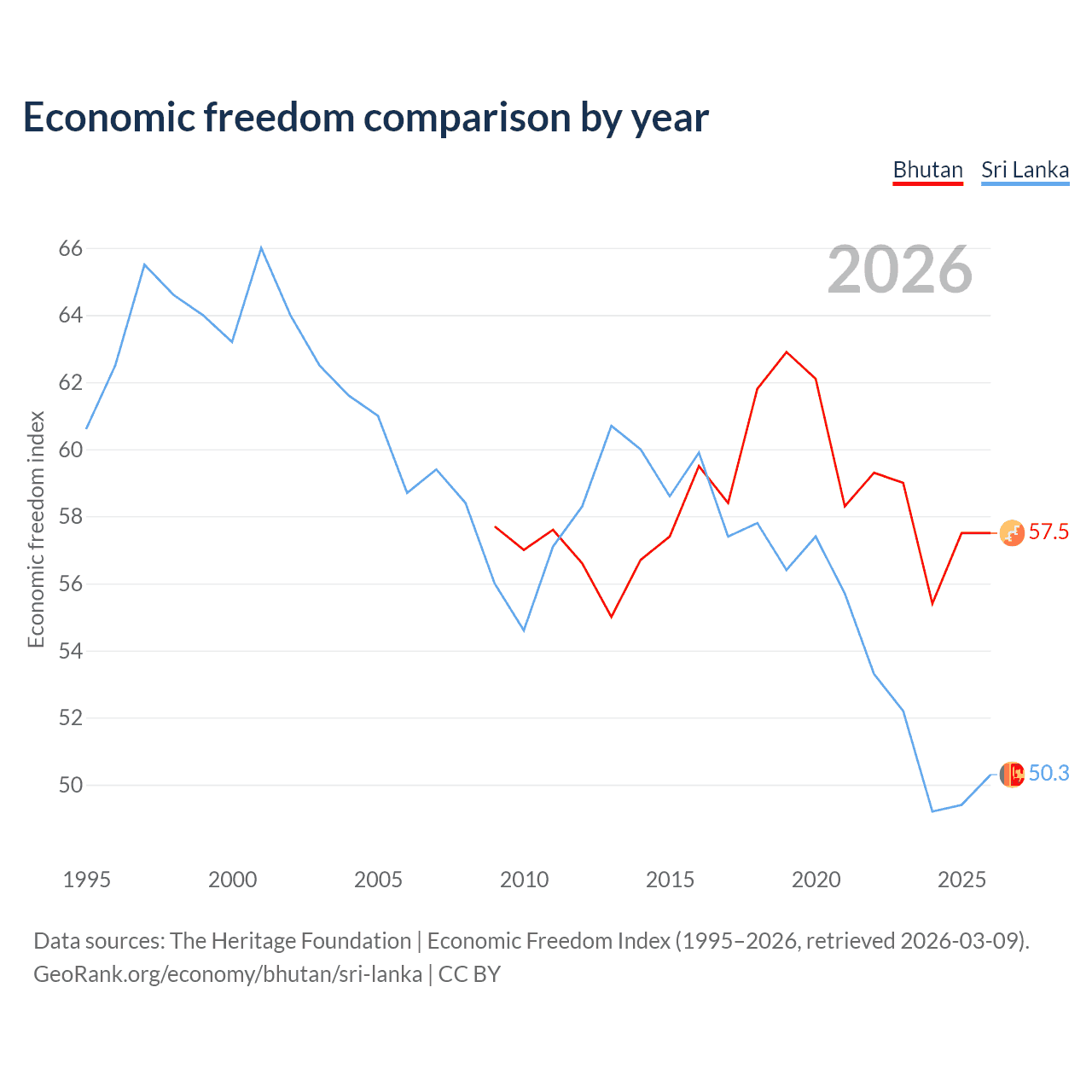 The Economic Freedom Index for Bhutan is 57.5, ranking 115/197, compared to 50.3 for Sri Lanka, ranking 162/197. The chart above displays a comparison of annual changes in economic freedom indexes.