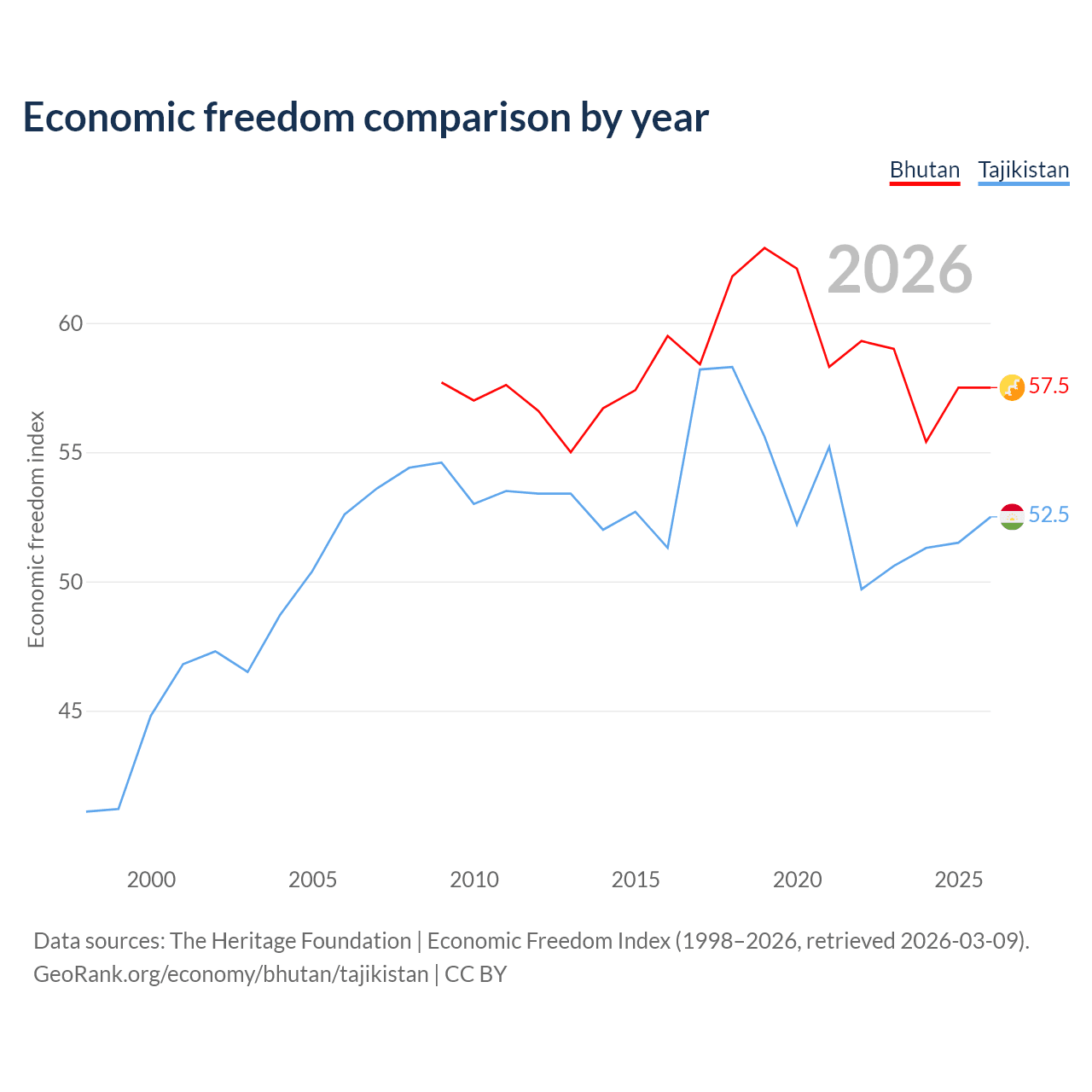 The Economic Freedom Index for Bhutan is 57.5, ranking 115/197, compared to 52.5 for Tajikistan, ranking 147/197. The chart above displays a comparison of annual changes in economic freedom indexes.