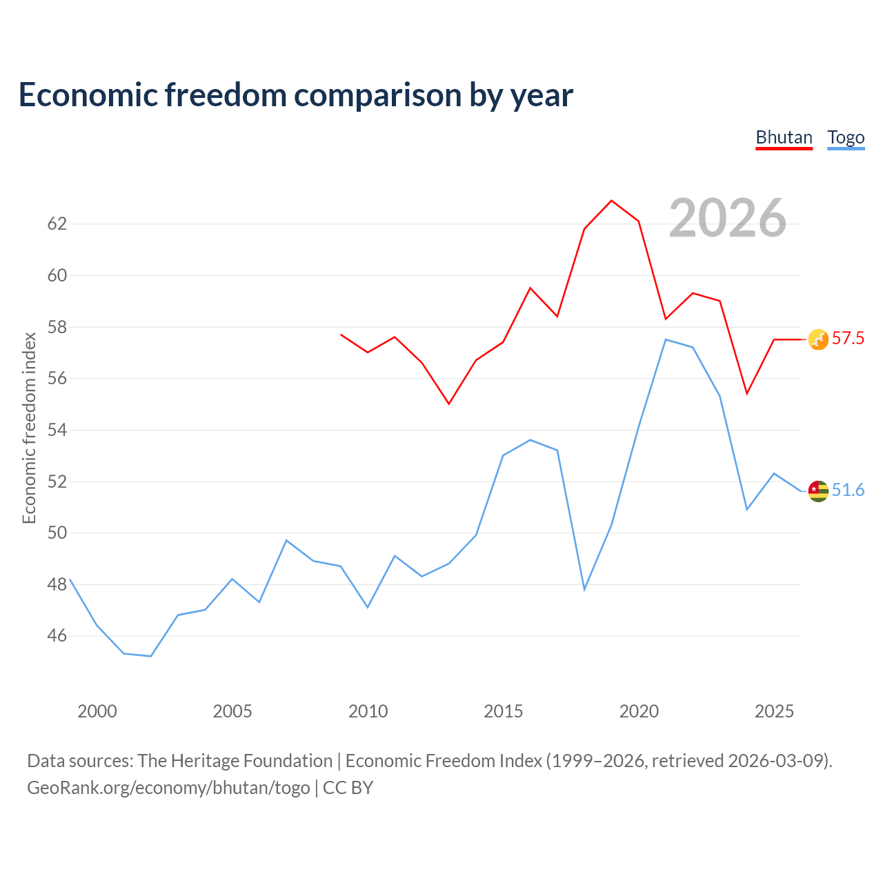 The Economic Freedom Index for Bhutan is 57.5, ranking 115/197, compared to 51.6 for Togo, ranking 153/197. The chart above displays a comparison of annual changes in economic freedom indexes.