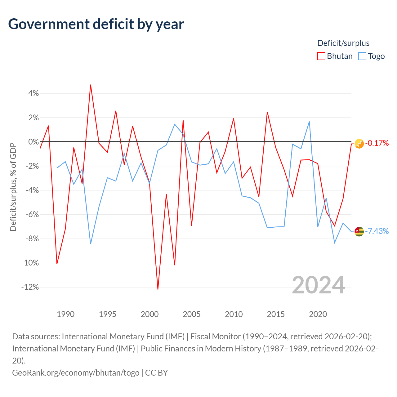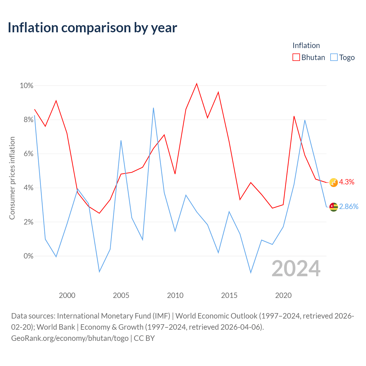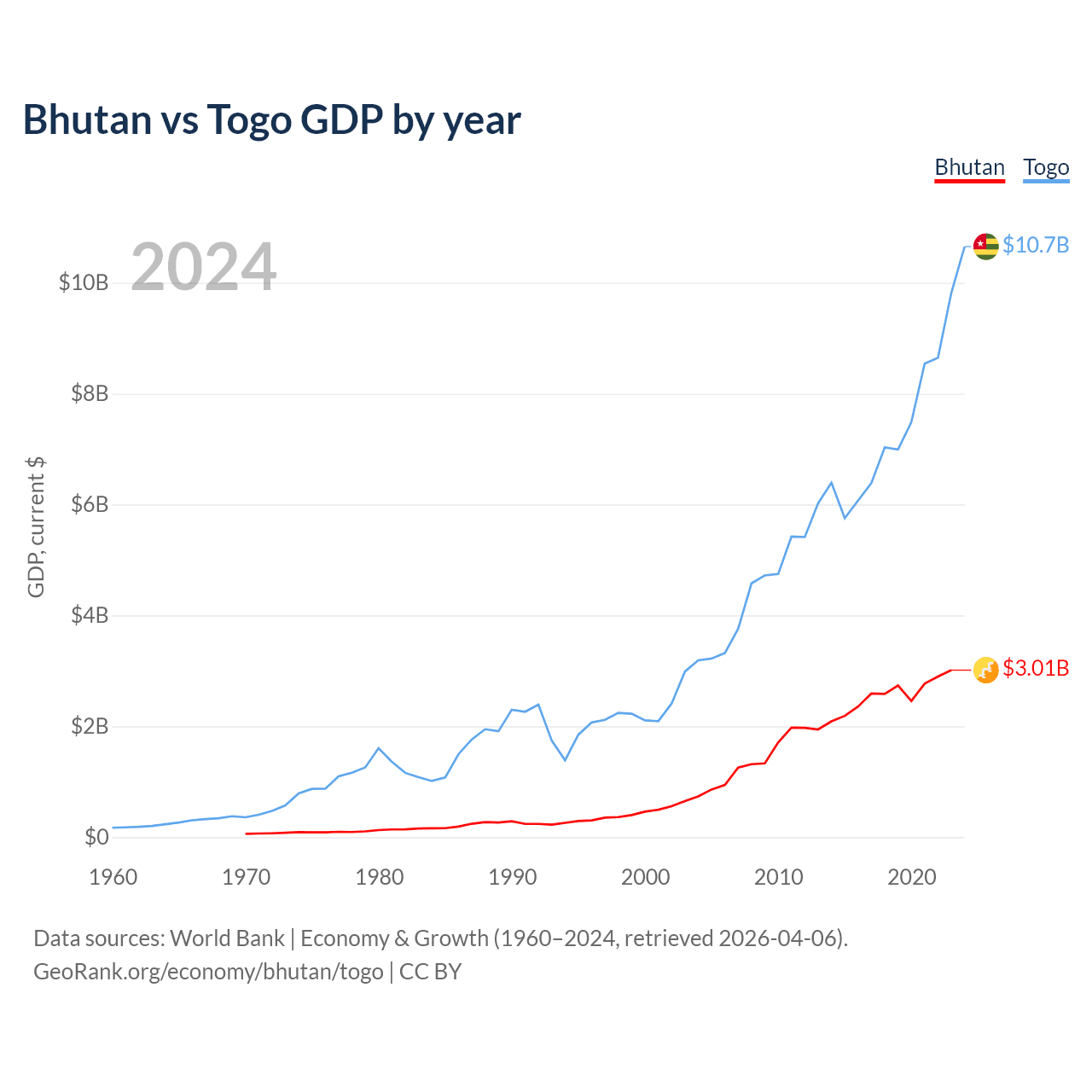 Bhutan has a GDP of $3.01B compared to $10.7B for Togo, ranking 170/197 and 154/197 by economy size, respectively.