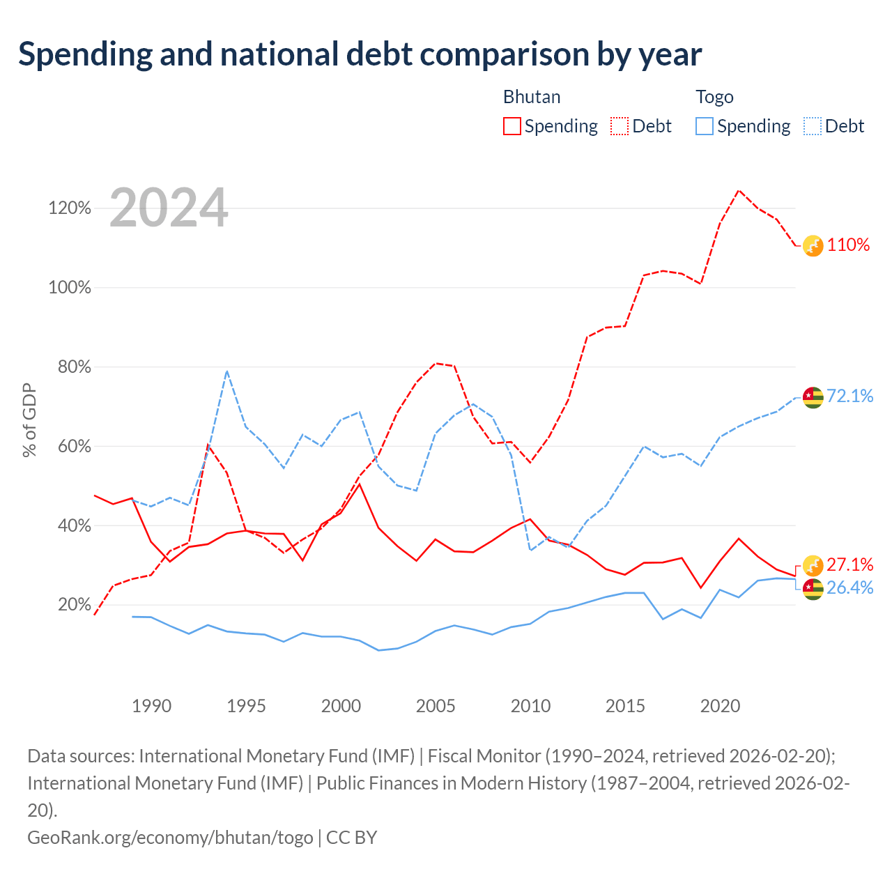 Bhutan has $3.53B in government debt (110.4% of GDP), compared to $7.68B (72.1% of GDP) in Togo.
