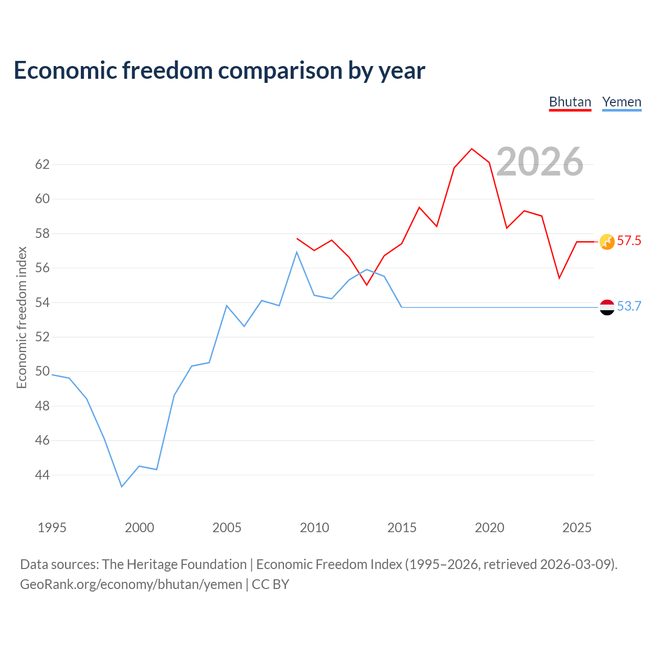 The Economic Freedom Index for Bhutan is 57.5, ranking 115/197, compared to 53.7 for Yemen, ranking 138/197. The chart above displays a comparison of annual changes in economic freedom indexes.