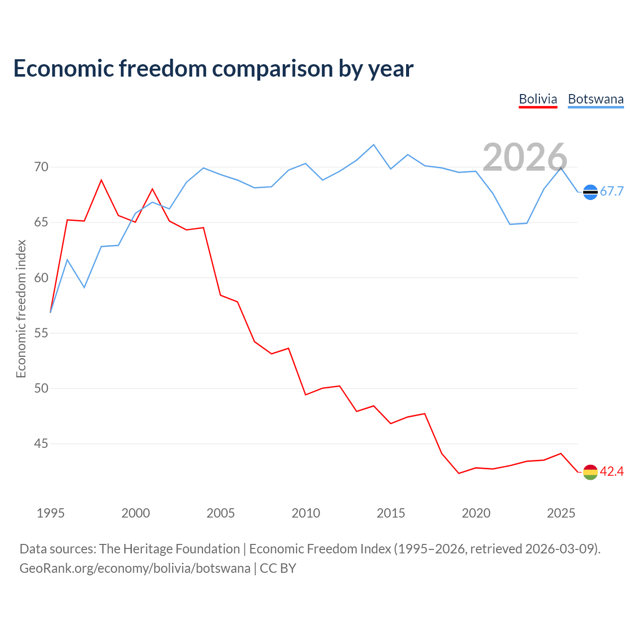 The Economic Freedom Index for Bolivia is 42.4, ranking 184/197, compared to 67.7 for Botswana, ranking 53/197. The chart above displays a comparison of annual changes in economic freedom indexes.
