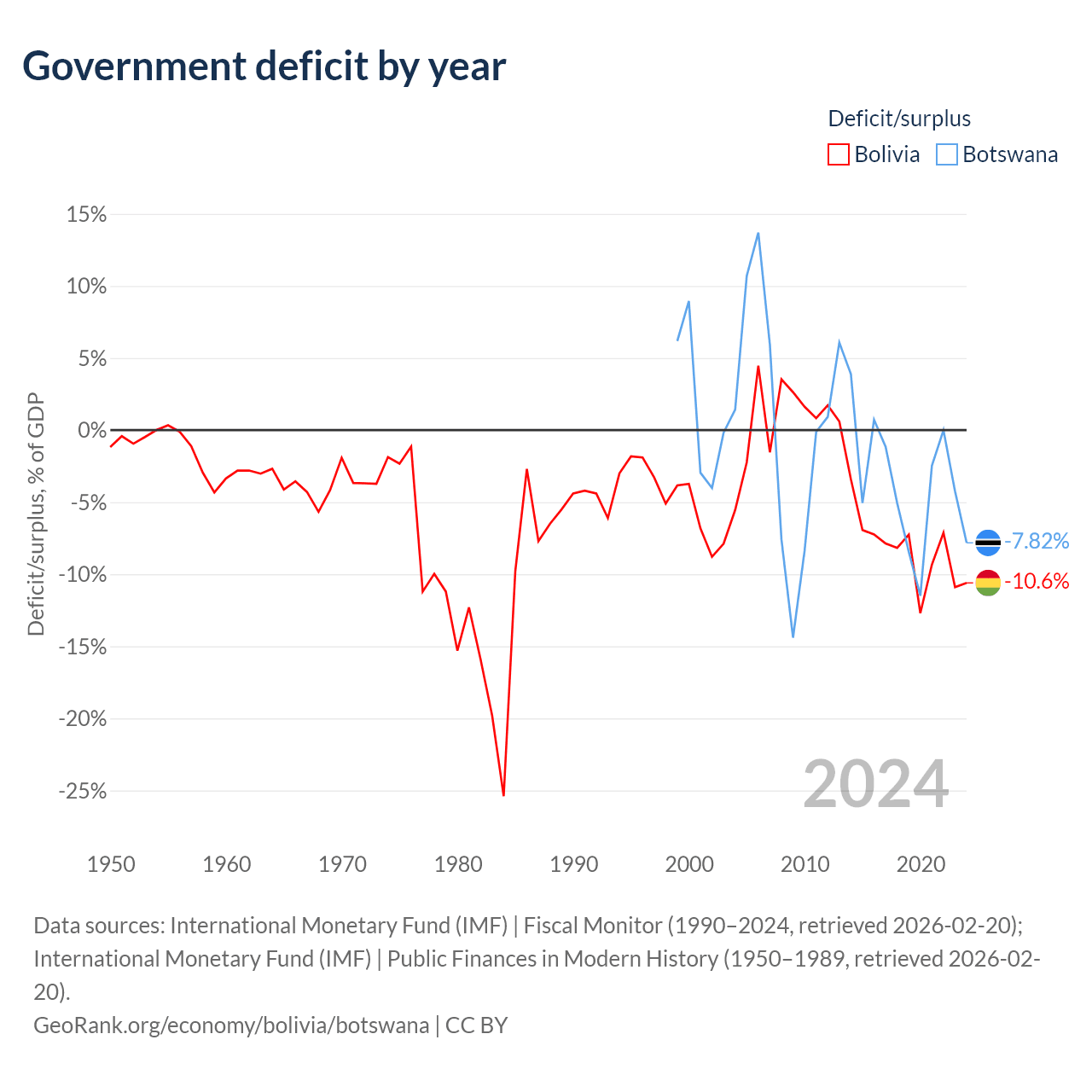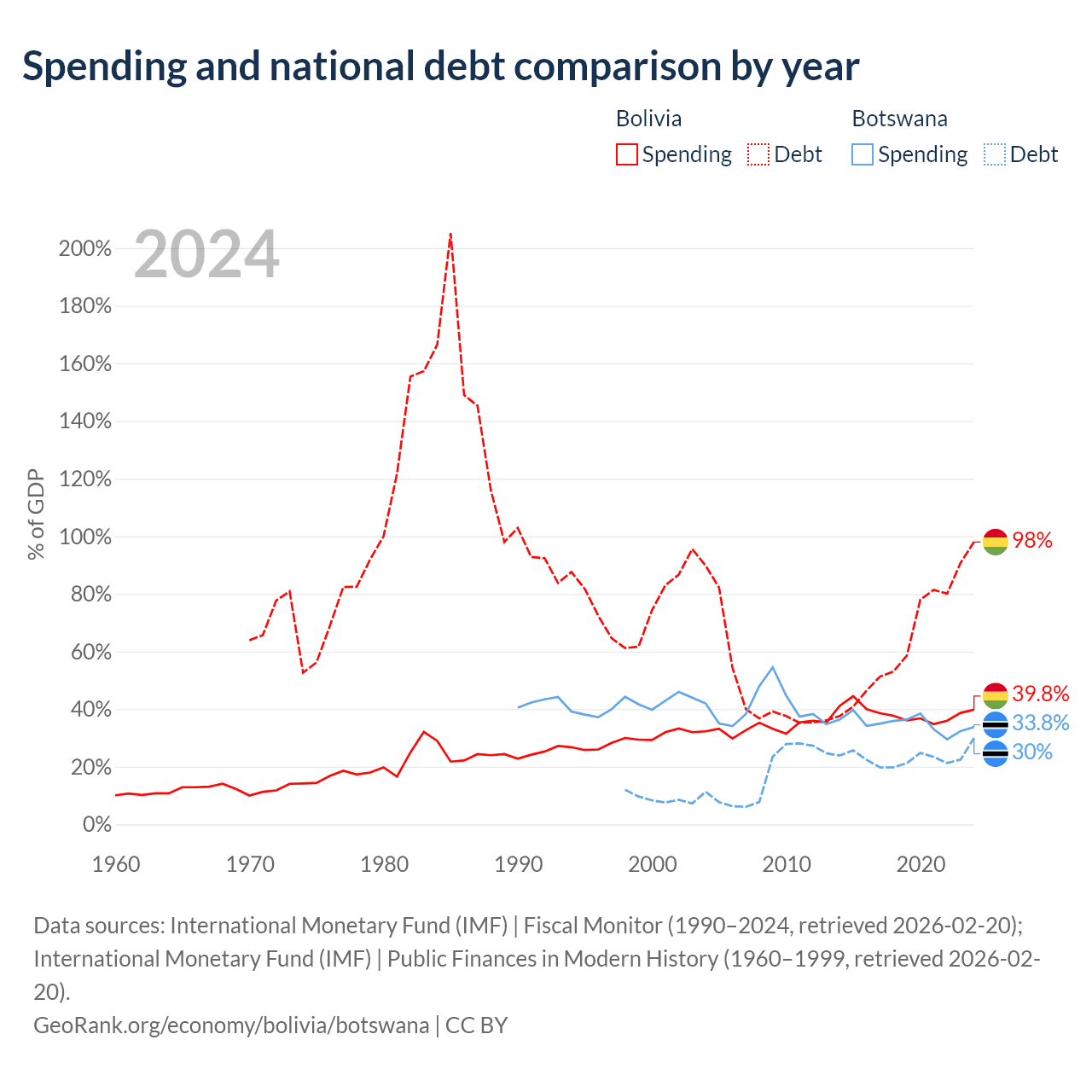 Bolivia has $53.8B in government debt (98% of GDP), compared to $5.82B (30% of GDP) in Botswana.