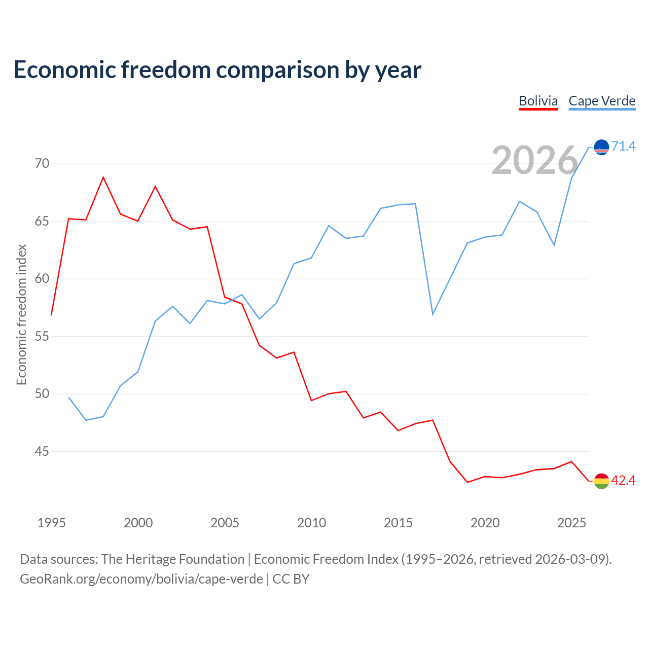 The Economic Freedom Index for Bolivia is 42.4, ranking 184/197, compared to 71.4 for Cape Verde, ranking 32/197. The chart above displays a comparison of annual changes in economic freedom indexes.