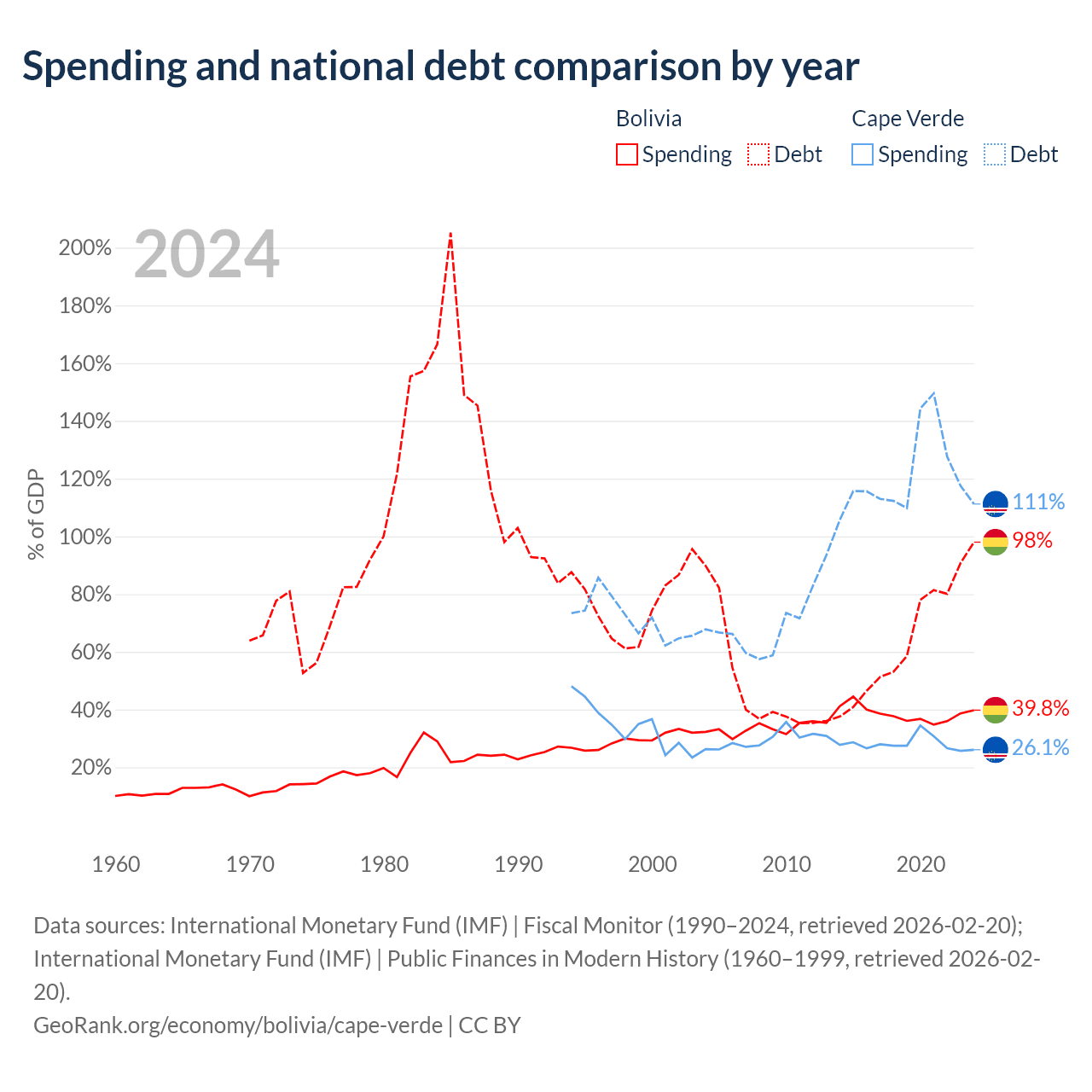 Bolivia has $53.8B in government debt (98% of GDP), compared to $3.03B (111.2% of GDP) in Cape Verde.
