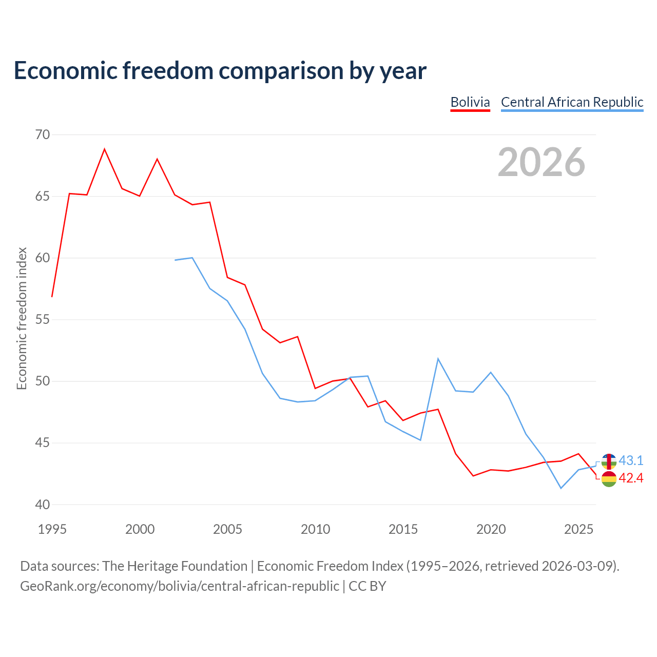 The Economic Freedom Index for Bolivia is 42.4, ranking 184/197, compared to 43.1 for the Central African Republic, ranking 182/197. The chart above displays a comparison of annual changes in economic freedom indexes.