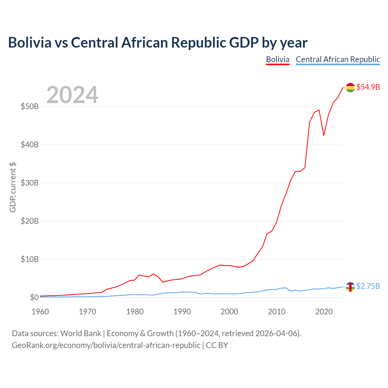 Bolivia has a GDP of $54.9B compared to $2.75B for the Central African Republic, ranking 88/197 and 171/197 by economy size, respectively.