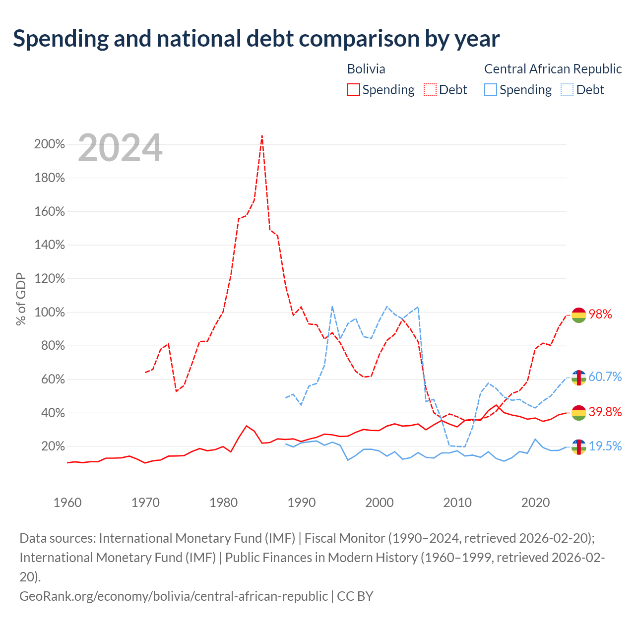 Bolivia has $53.8B in government debt (98% of GDP), compared to $1.67B (60.7% of GDP) in the Central African Republic.