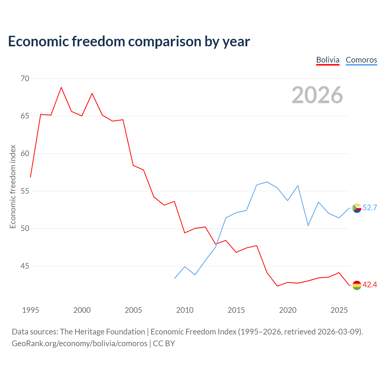 The Economic Freedom Index for Bolivia is 42.4, ranking 184/197, compared to 52.7 for Comoros, ranking 145/197. The chart above displays a comparison of annual changes in economic freedom indexes.