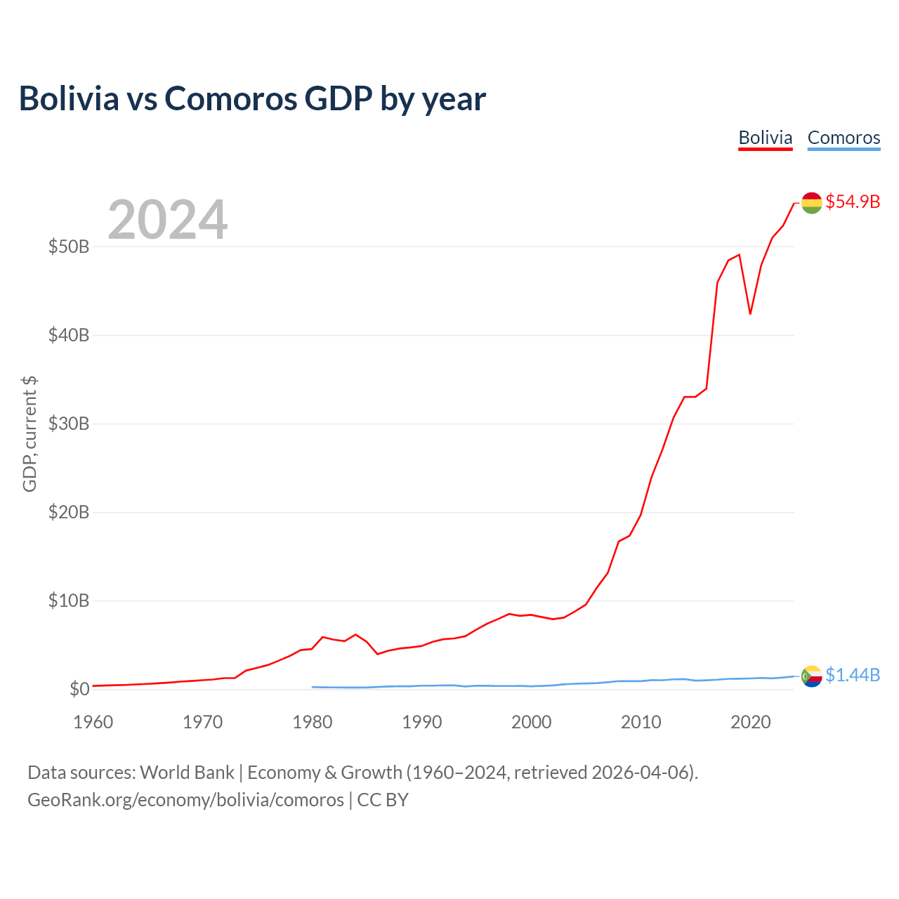 Bolivia has a GDP of $54.9B compared to $1.44B for Comoros, ranking 88/197 and 183/197 by economy size, respectively.