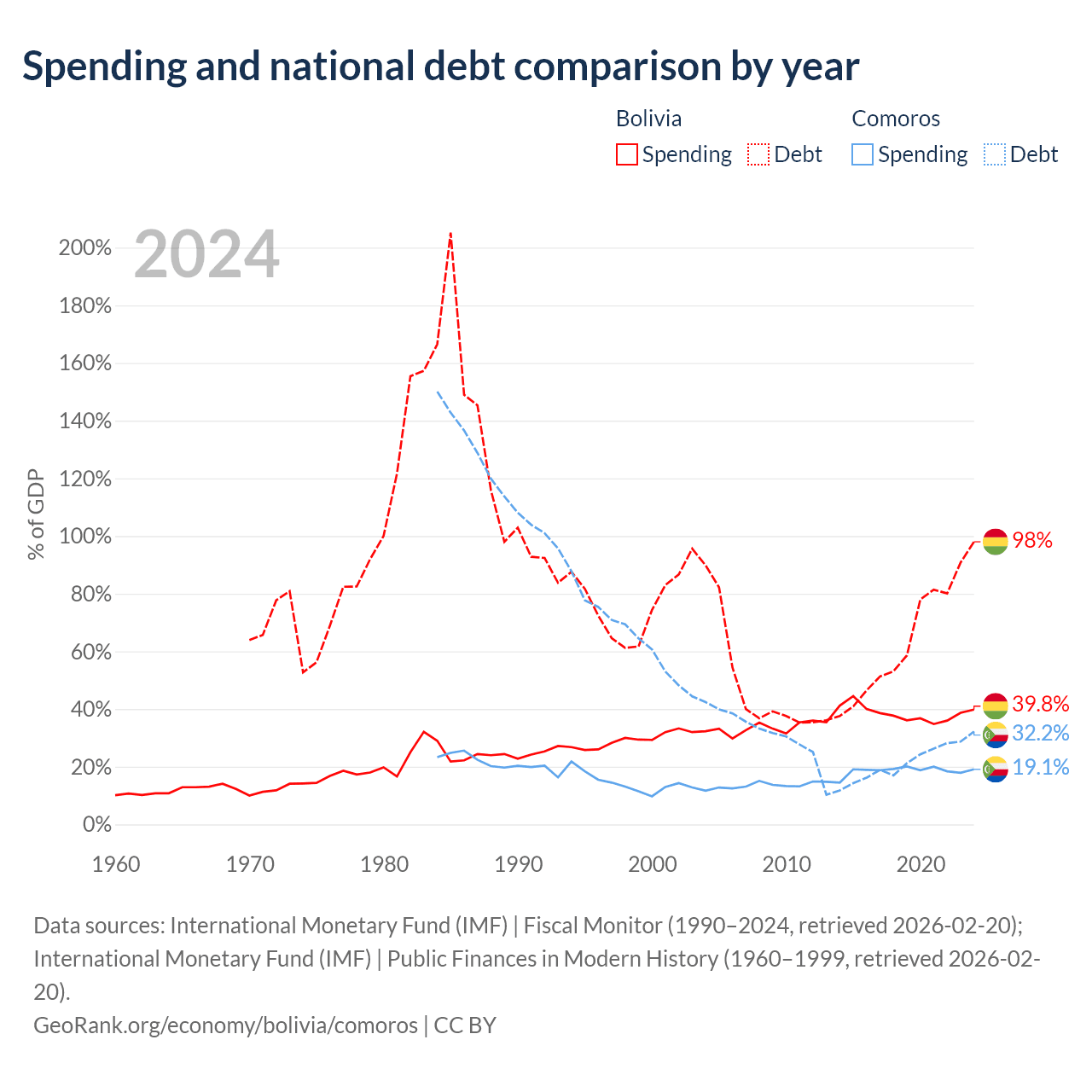 Bolivia has $53.8B in government debt (98% of GDP), compared to $463M (32.2% of GDP) in Comoros.