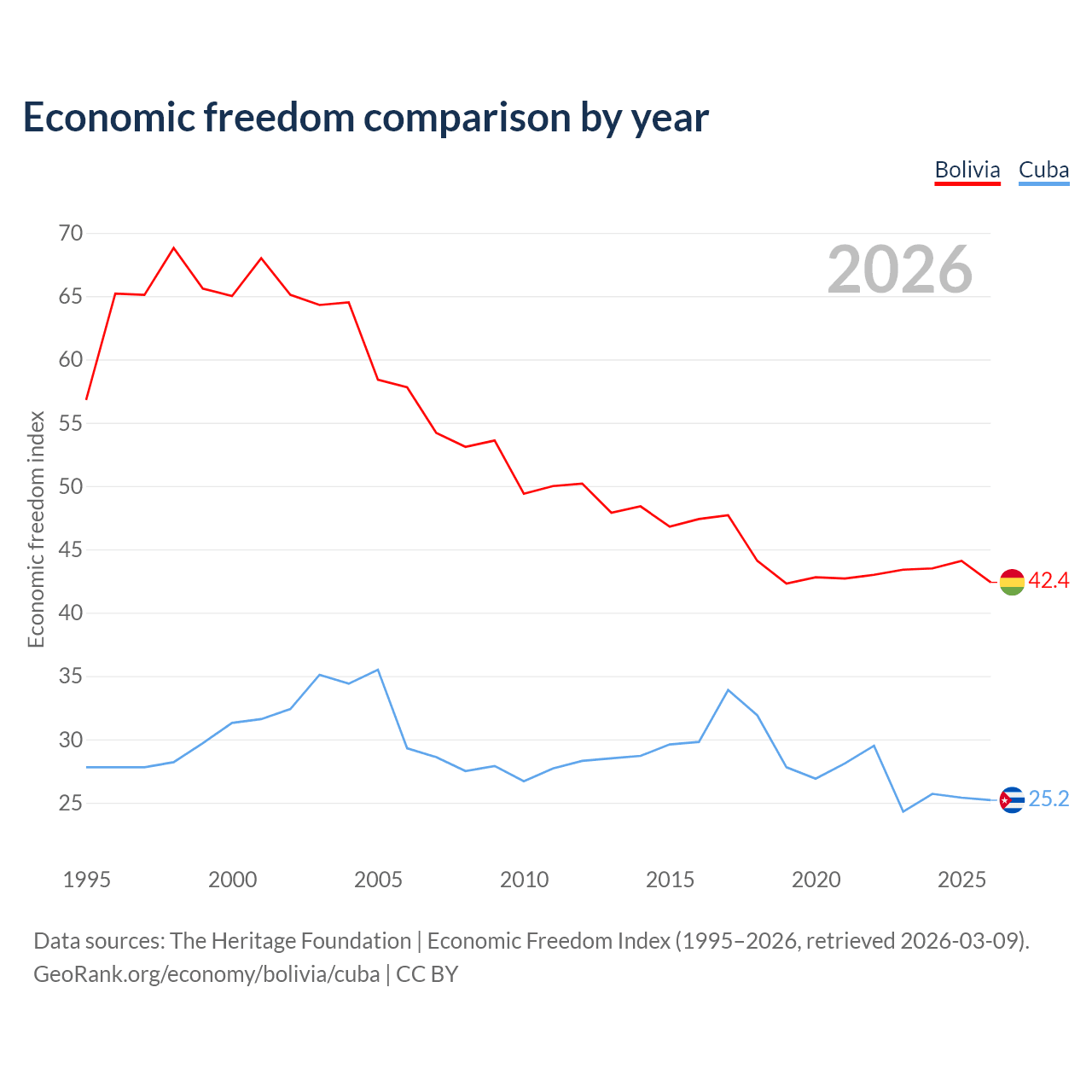The Economic Freedom Index for Bolivia is 42.4, ranking 184/197, compared to 25.2 for Cuba, ranking 195/197. The chart above displays a comparison of annual changes in economic freedom indexes.