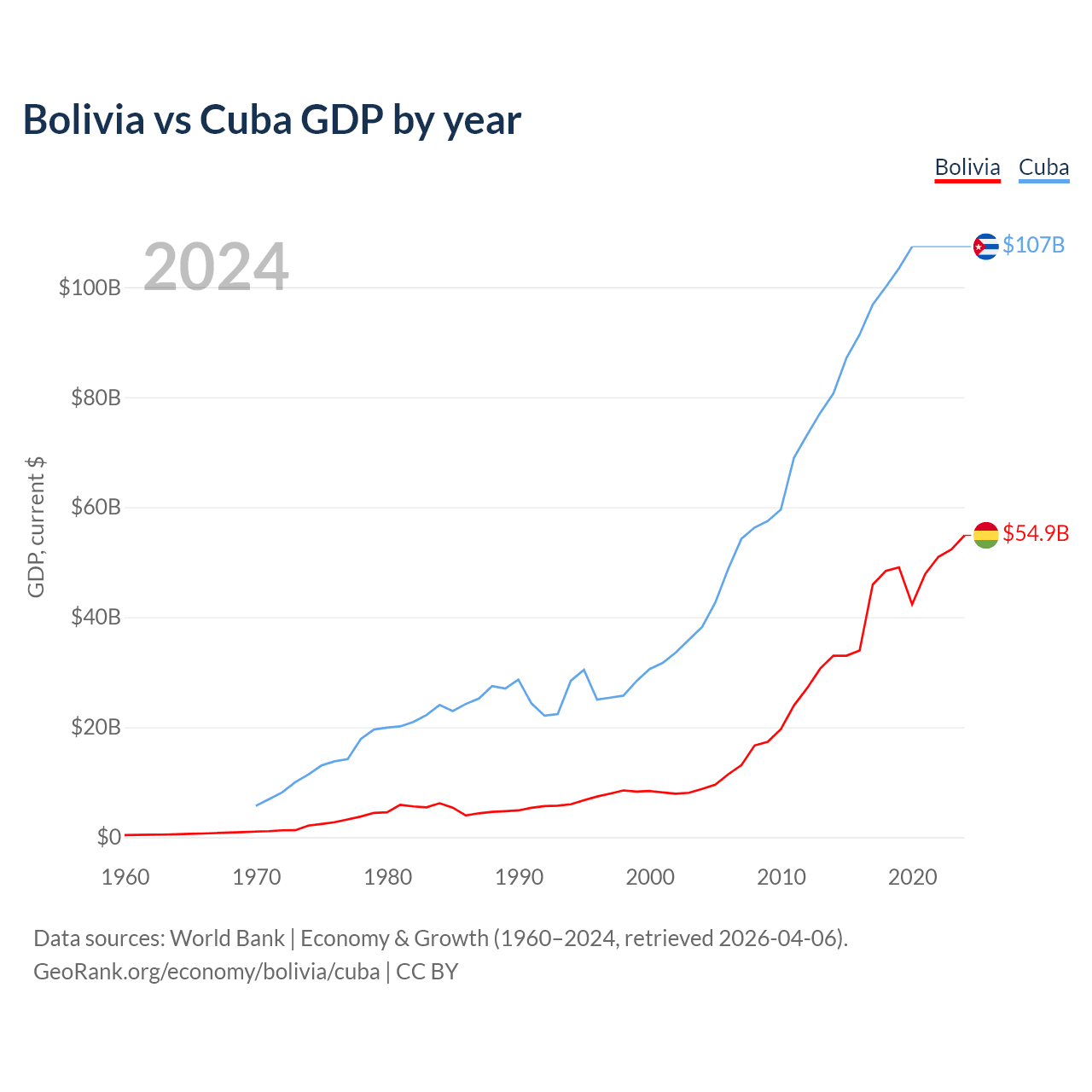 Bolivia has a GDP of $54.9B compared to $107B for Cuba, ranking 88/197 and 69/197 by economy size, respectively.