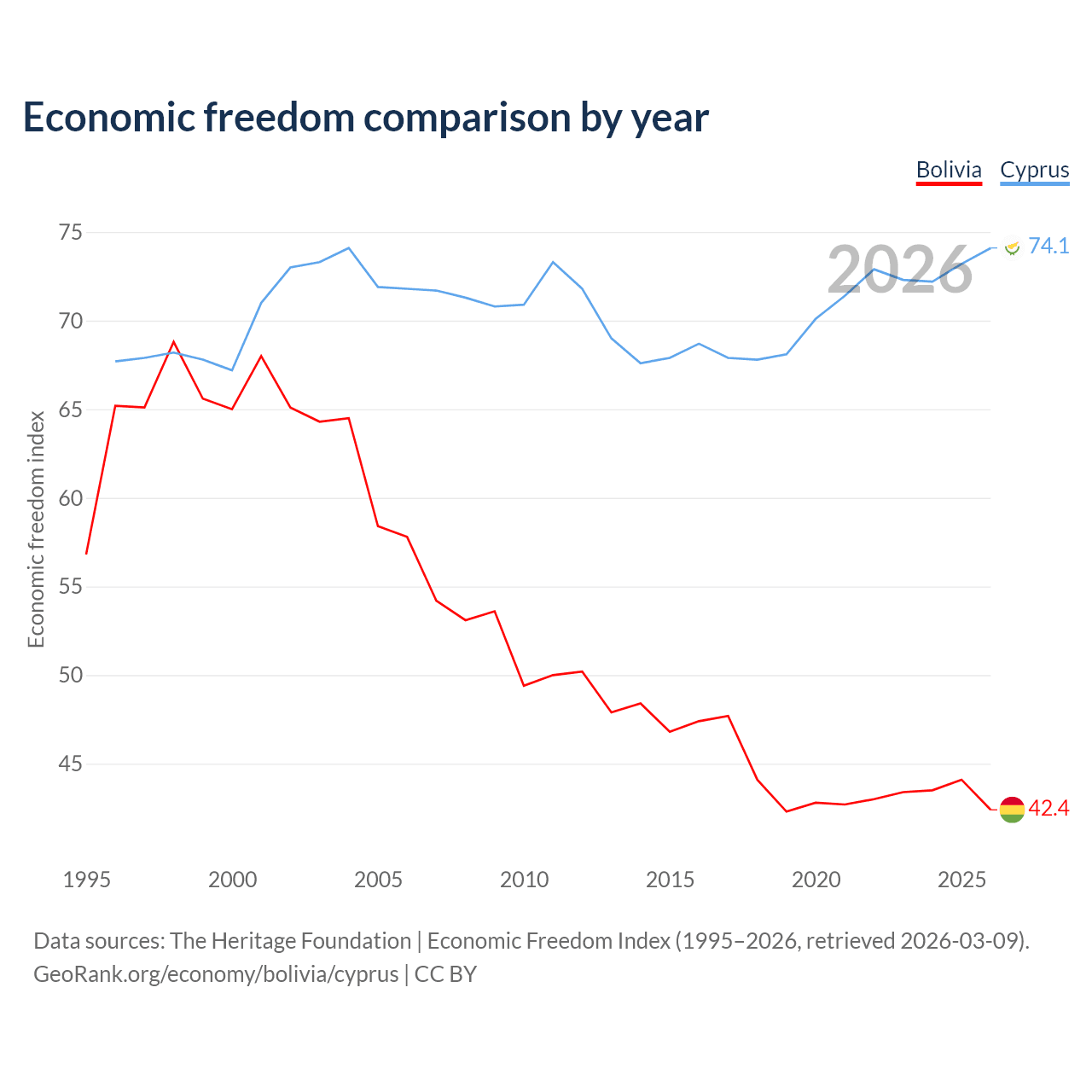 The Economic Freedom Index for Bolivia is 42.4, ranking 184/197, compared to 74.1 for Cyprus, ranking 21/197. The chart above displays a comparison of annual changes in economic freedom indexes.