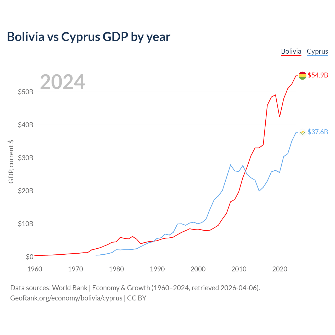 Bolivia has a GDP of $54.9B compared to $37.6B for Cyprus, ranking 88/197 and 103/197 by economy size, respectively.