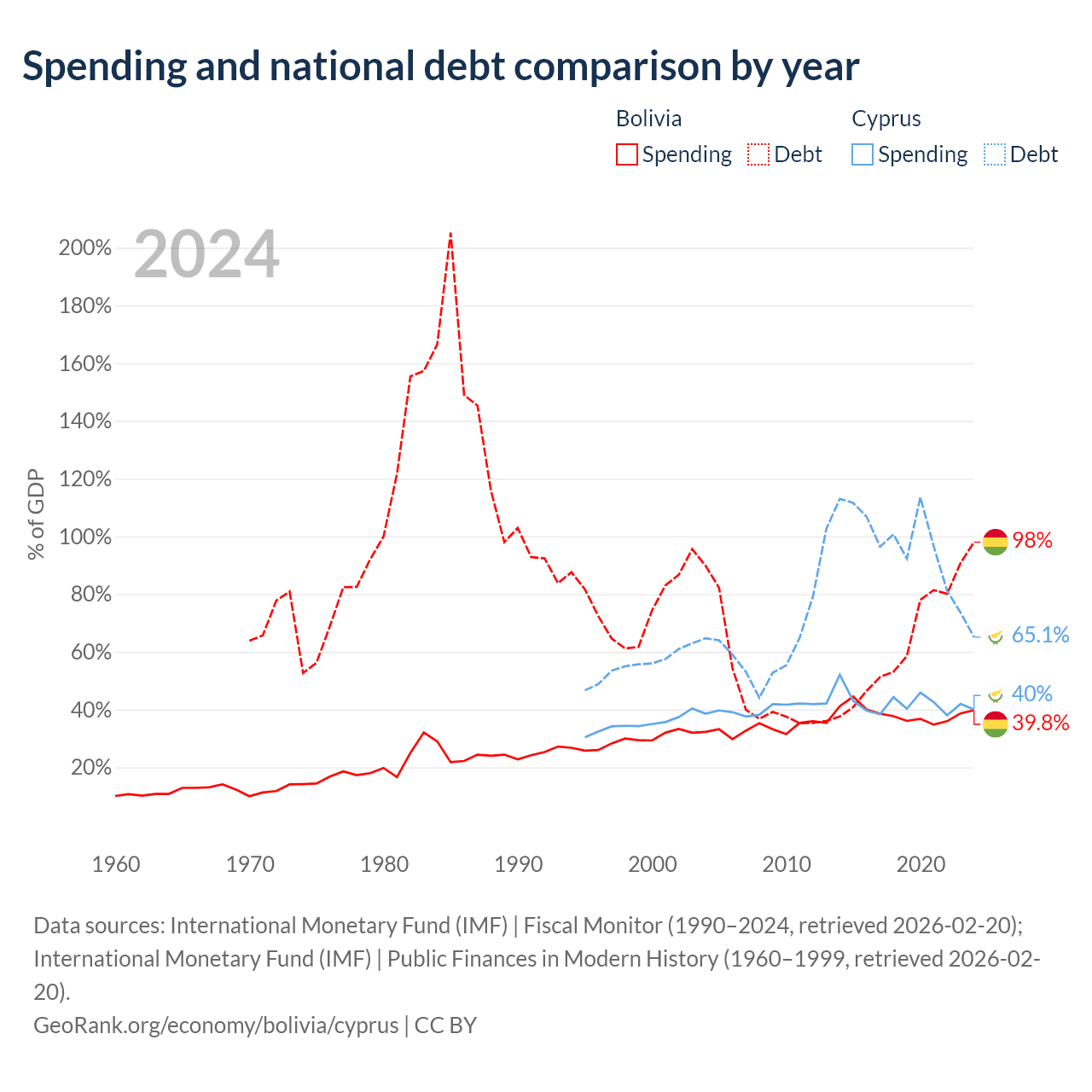 Bolivia has $53.8B in government debt (98% of GDP), compared to $24.5B (65.1% of GDP) in Cyprus.