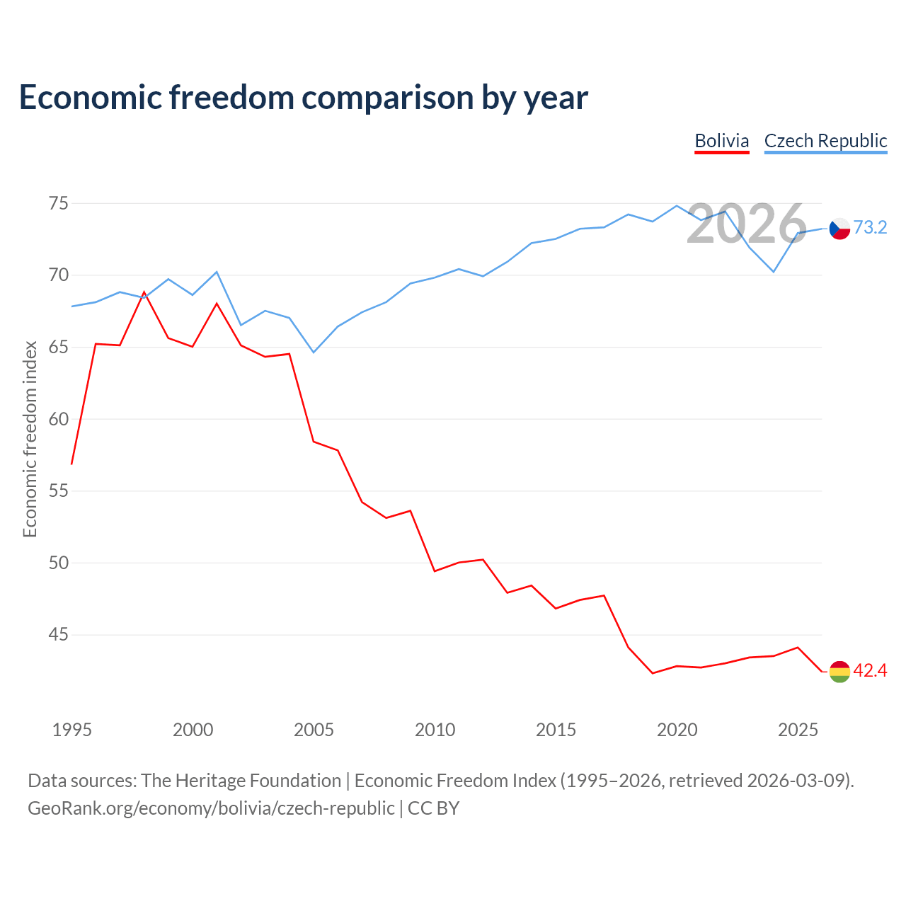 The Economic Freedom Index for Bolivia is 42.4, ranking 184/197, compared to 73.2 for the Czech Republic, ranking 25/197. The chart above displays a comparison of annual changes in economic freedom indexes.