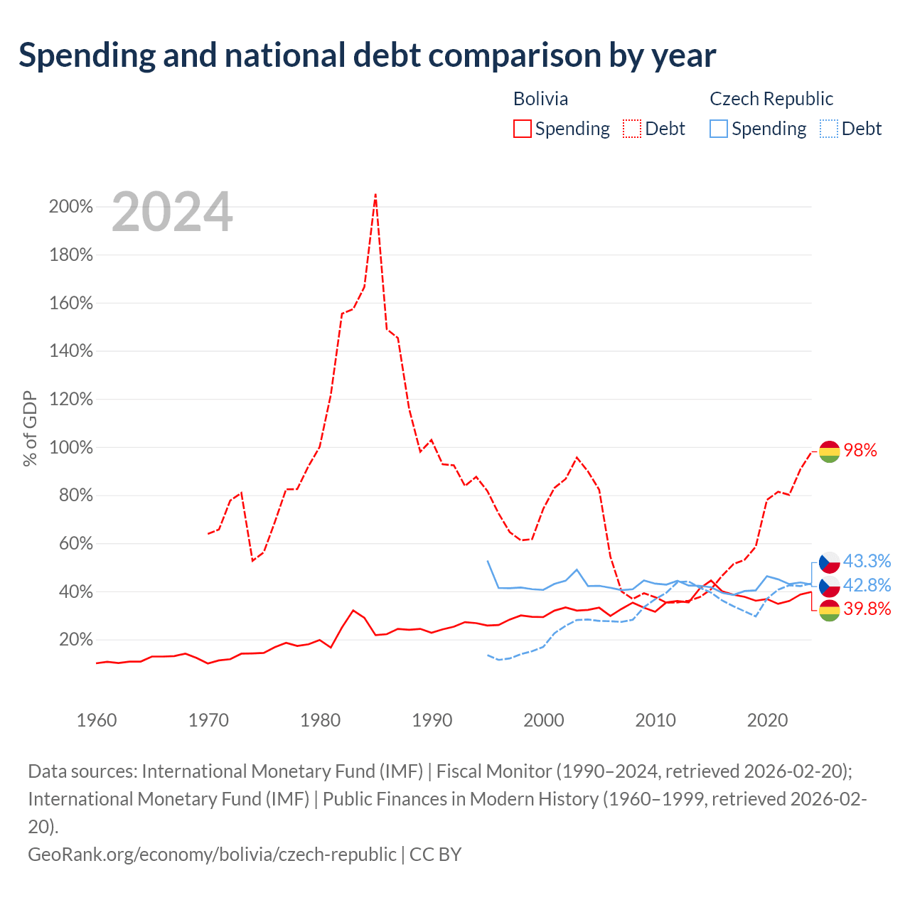 Bolivia has $53.8B in government debt (98% of GDP), compared to $150B (43.3% of GDP) in the Czech Republic.