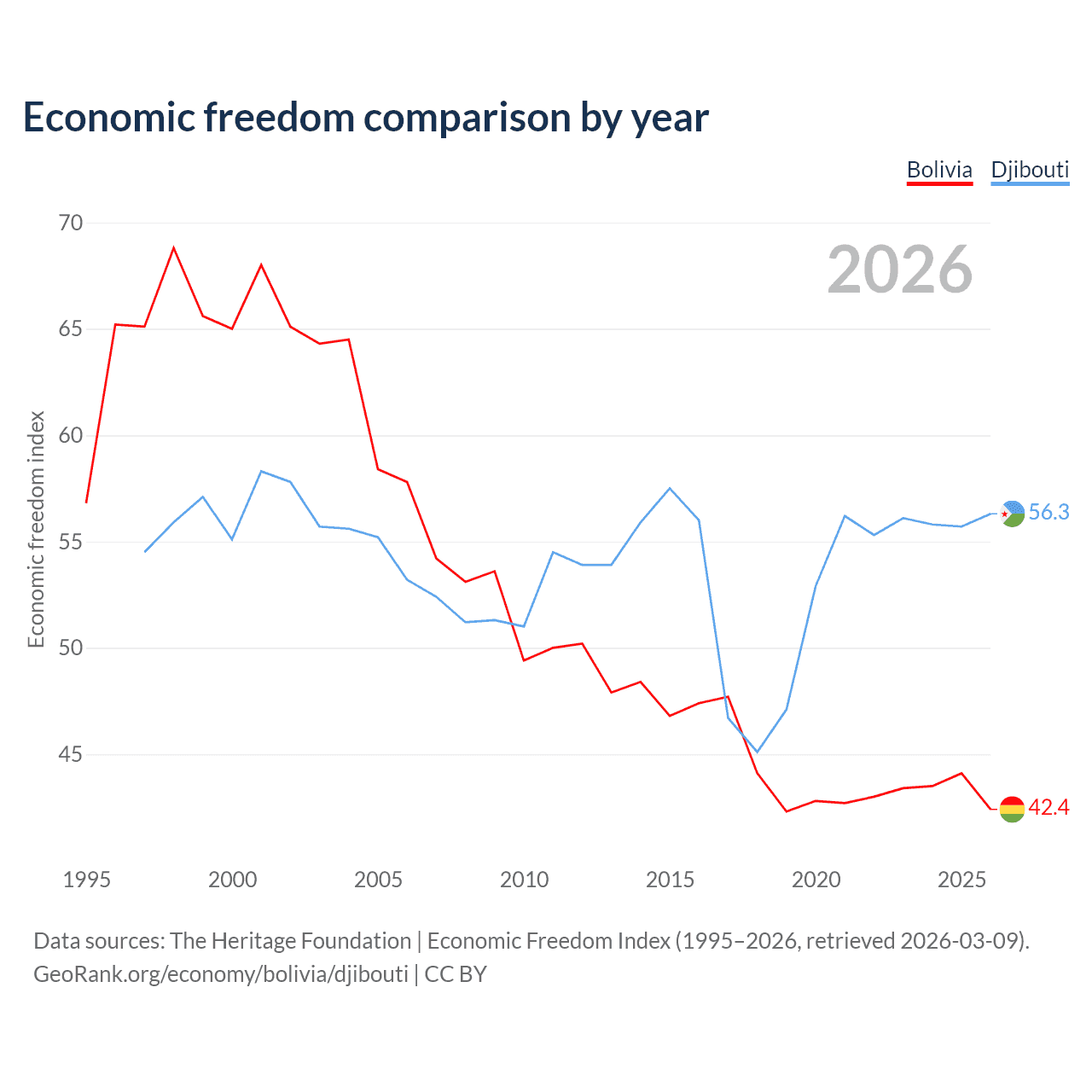 The Economic Freedom Index for Bolivia is 42.4, ranking 184/197, compared to 56.3 for Djibouti, ranking 122/197. The chart above displays a comparison of annual changes in economic freedom indexes.