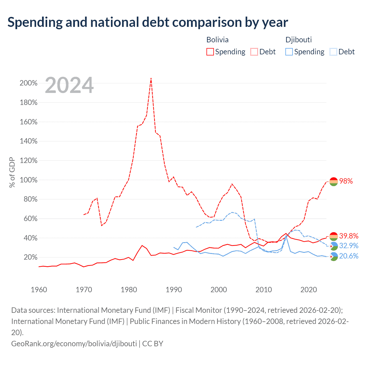 Bolivia has $53.8B in government debt (98% of GDP), compared to $1.36B (32.9% of GDP) in Djibouti.