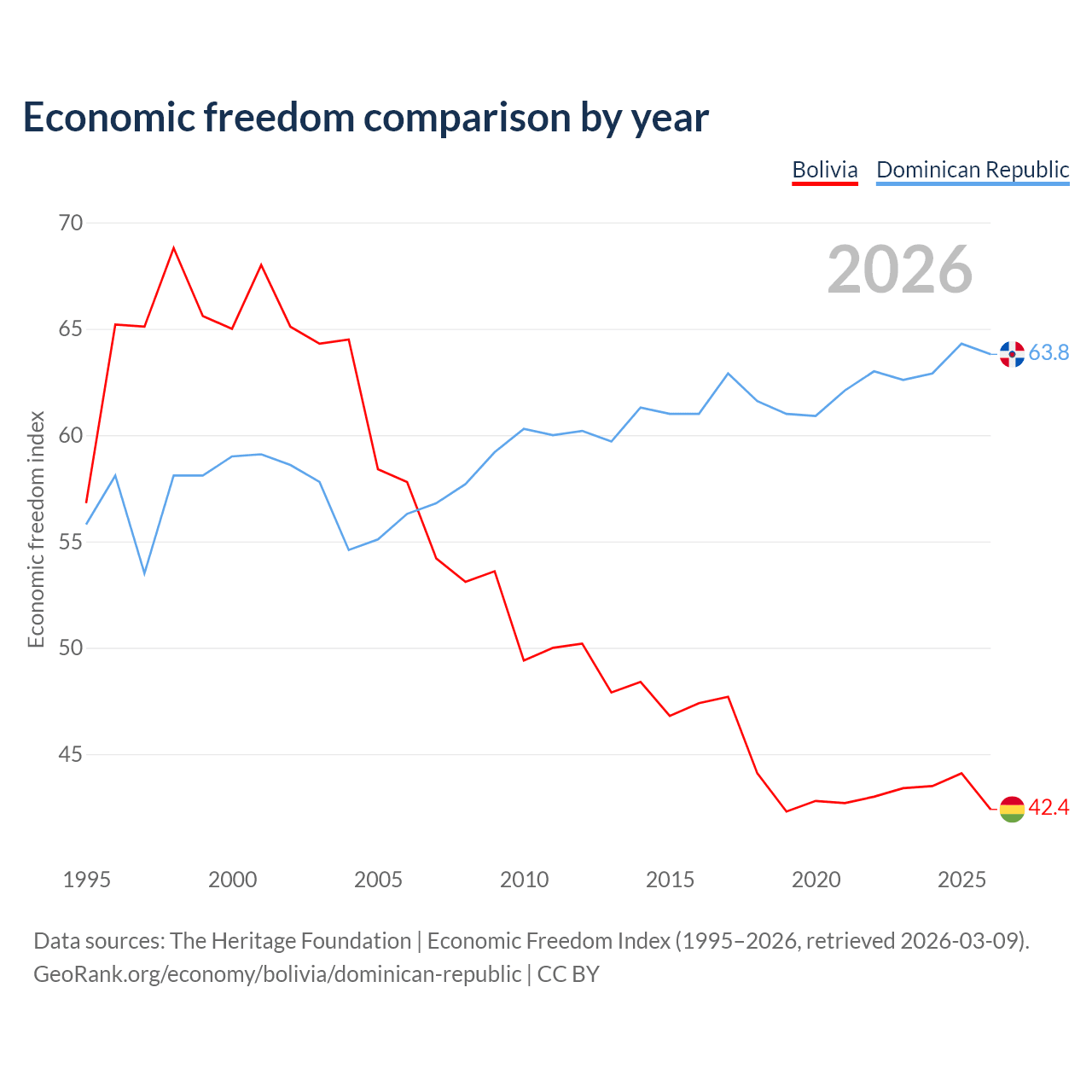 The Economic Freedom Index for Bolivia is 42.4, ranking 184/197, compared to 63.8 for the Dominican Republic, ranking 77/197. The chart above displays a comparison of annual changes in economic freedom indexes.