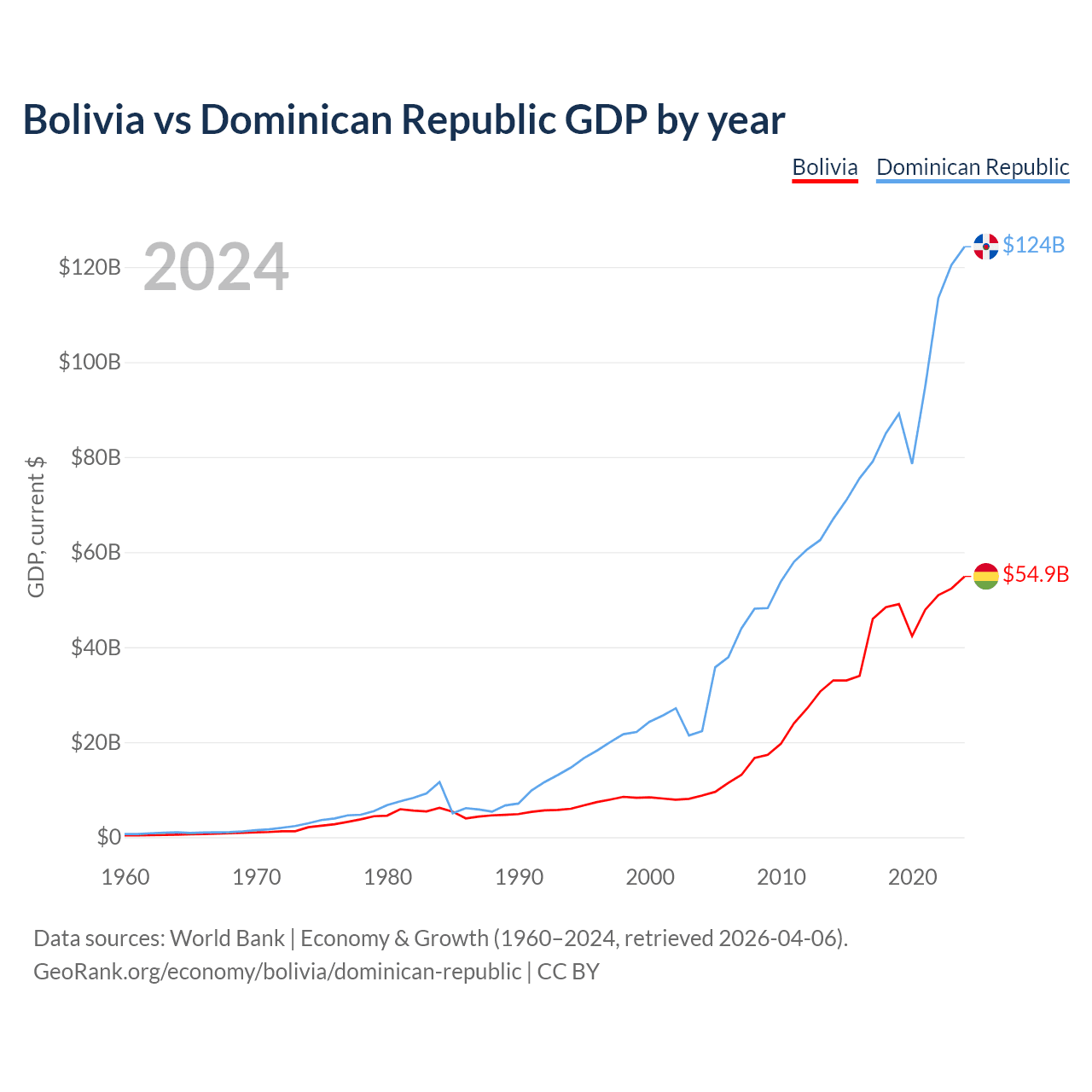 Bolivia has a GDP of $54.9B compared to $124B for the Dominican Republic, ranking 88/197 and 63/197 by economy size, respectively.