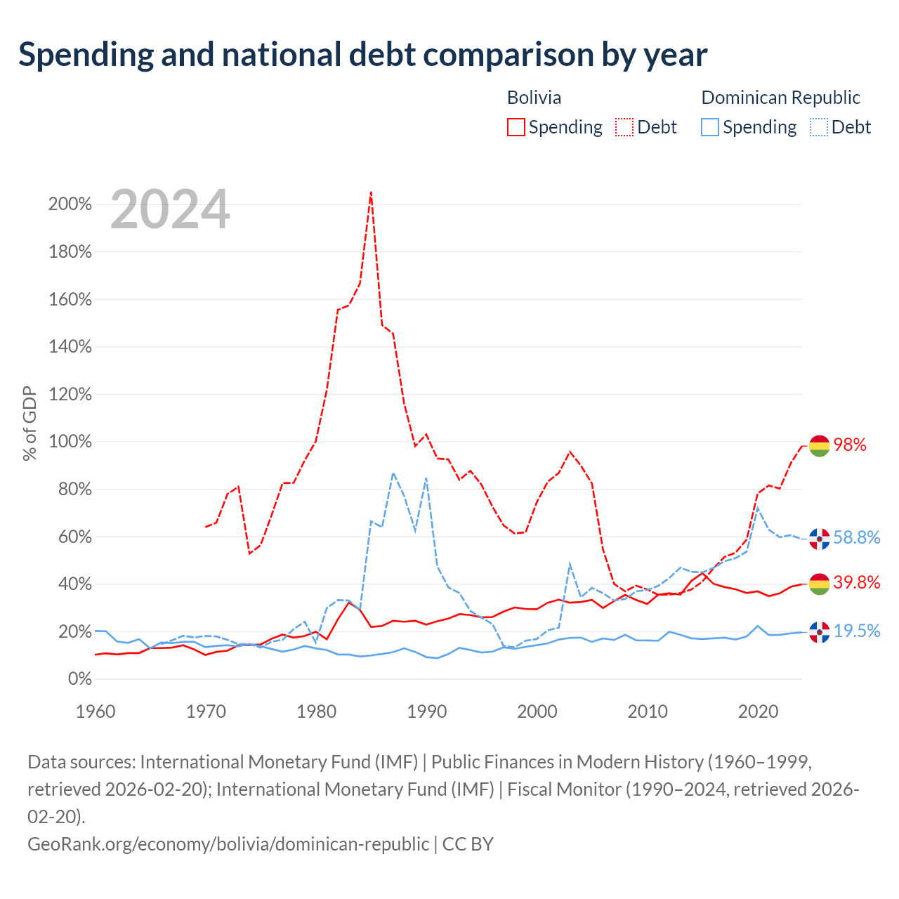 Bolivia has $53.8B in government debt (98% of GDP), compared to $73.1B (58.8% of GDP) in the Dominican Republic.