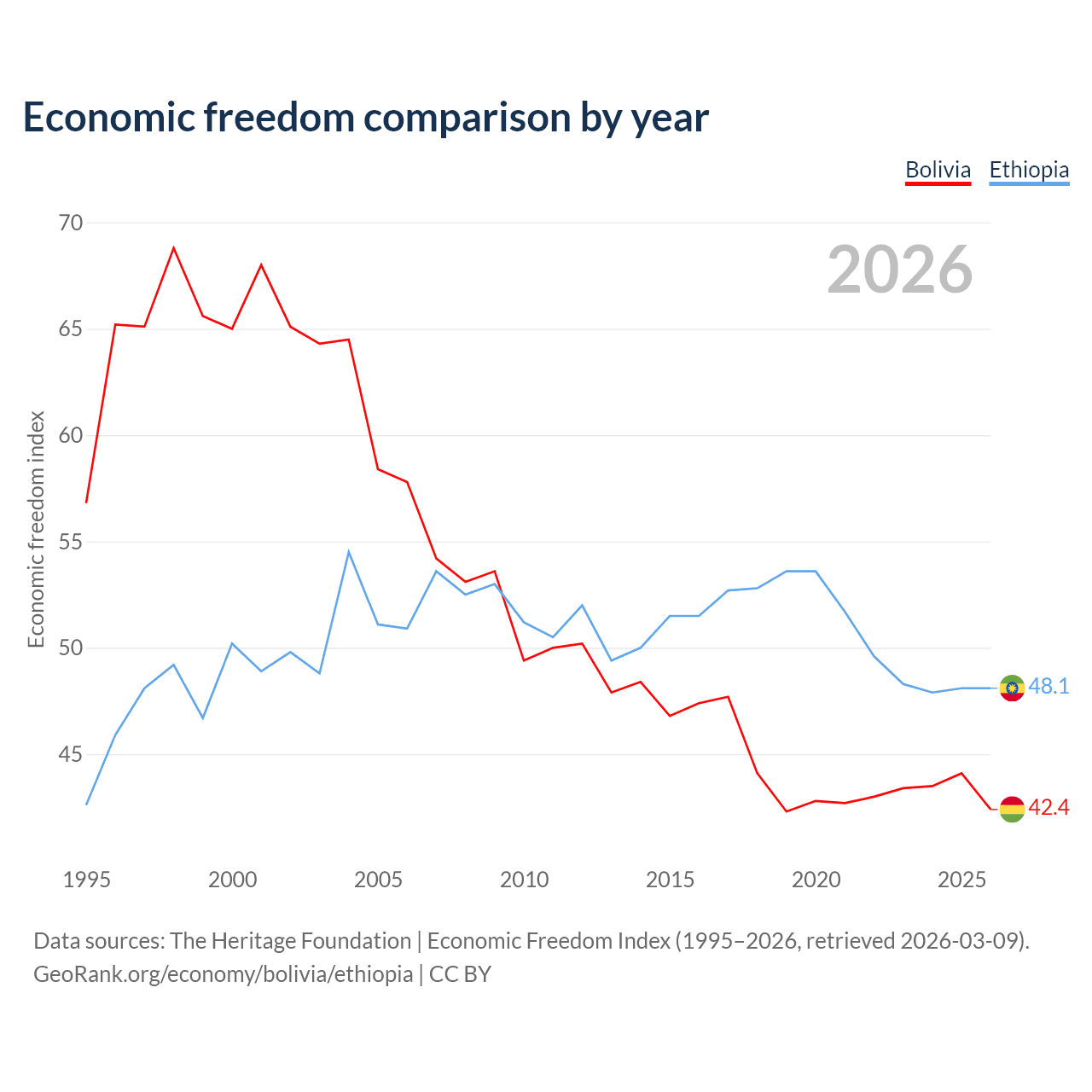 The Economic Freedom Index for Bolivia is 42.4, ranking 184/197, compared to 48.1 for Ethiopia, ranking 171/197. The chart above displays a comparison of annual changes in economic freedom indexes.