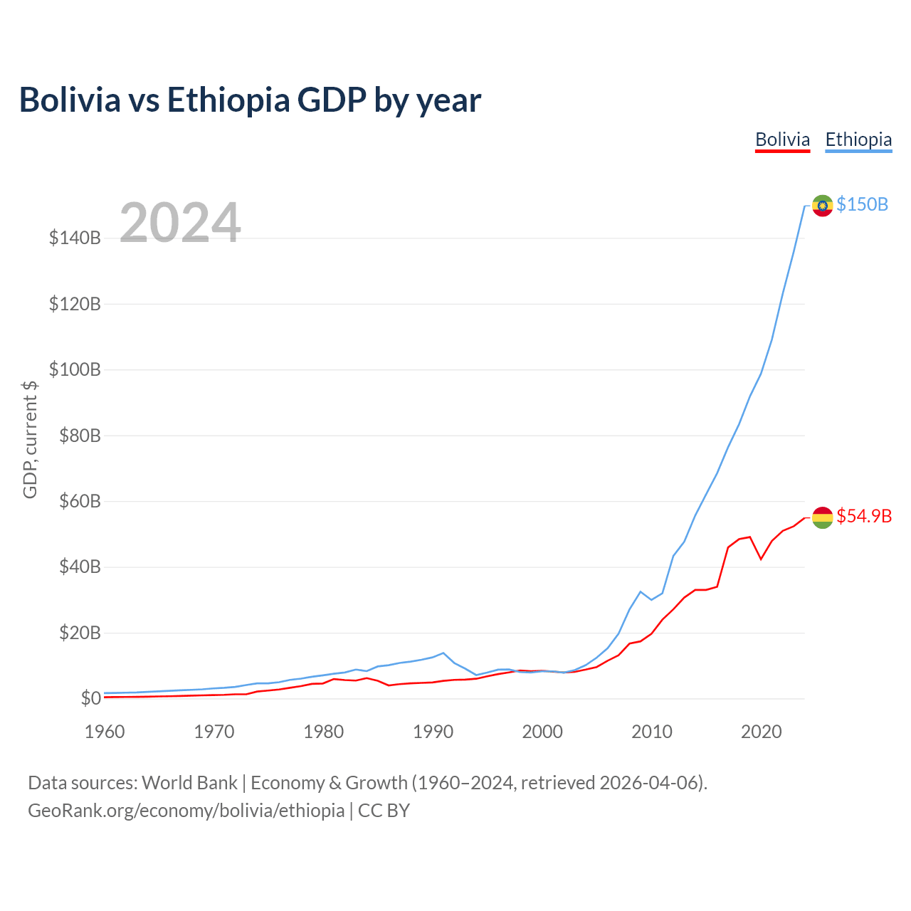 Bolivia has a GDP of $54.9B compared to $150B for Ethiopia, ranking 88/197 and 60/197 by economy size, respectively.