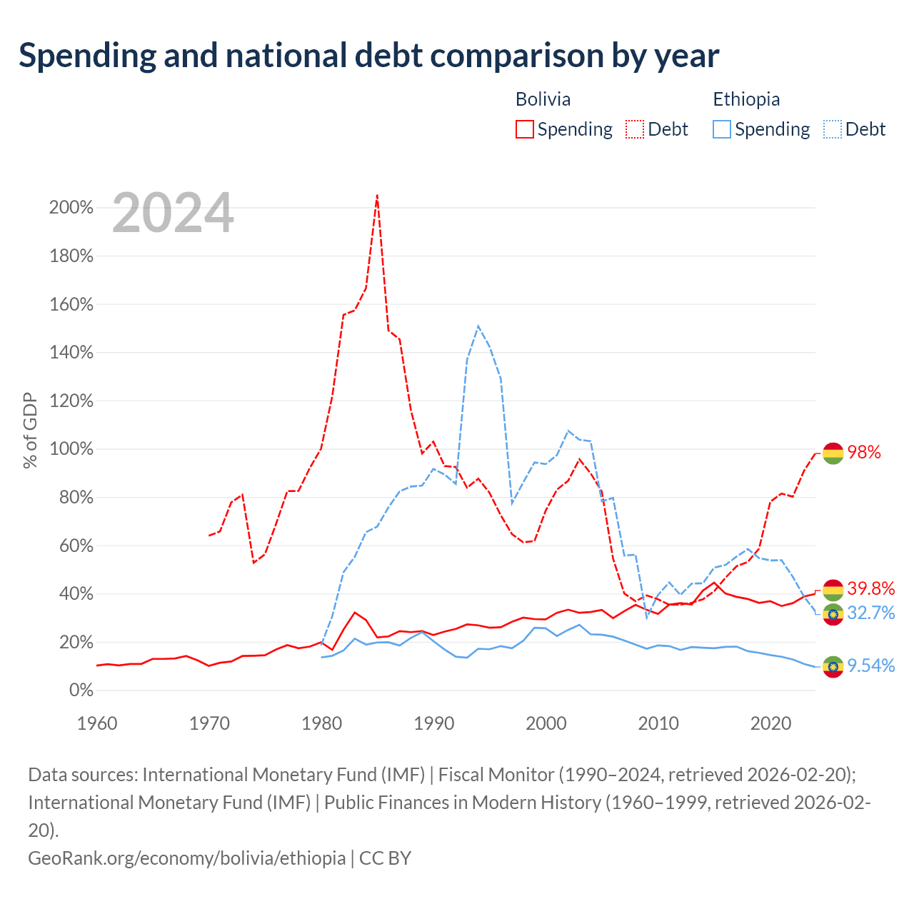 Bolivia has $53.8B in government debt (98% of GDP), compared to $48.9B (32.7% of GDP) in Ethiopia.