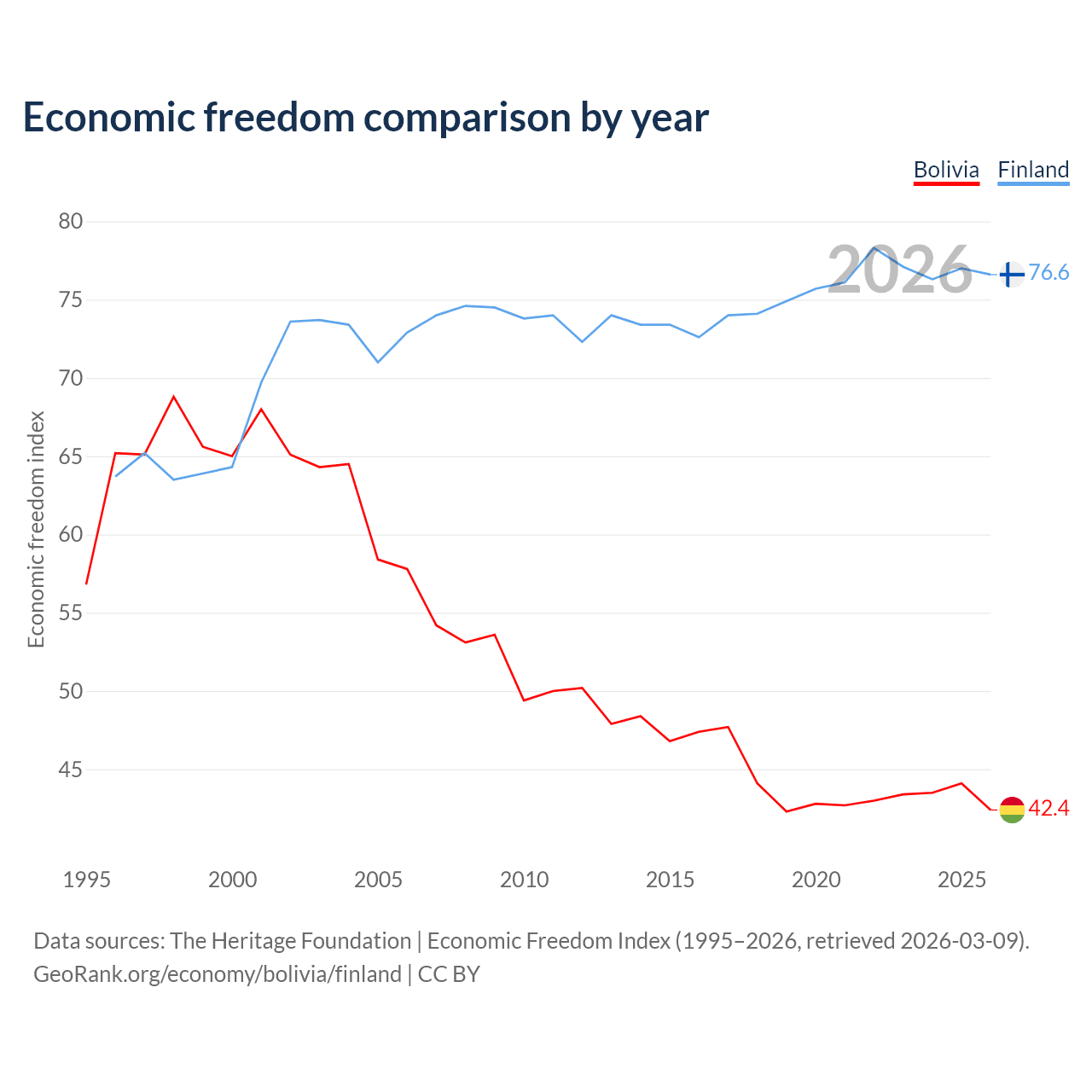 The Economic Freedom Index for Bolivia is 42.4, ranking 184/197, compared to 76.6 for Finland, ranking 15/197. The chart above displays a comparison of annual changes in economic freedom indexes.