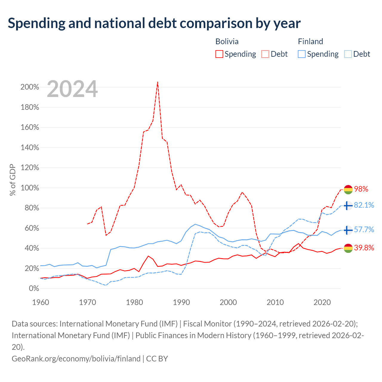 Bolivia has $53.8B in government debt (98% of GDP), compared to $245B (82.1% of GDP) in Finland.