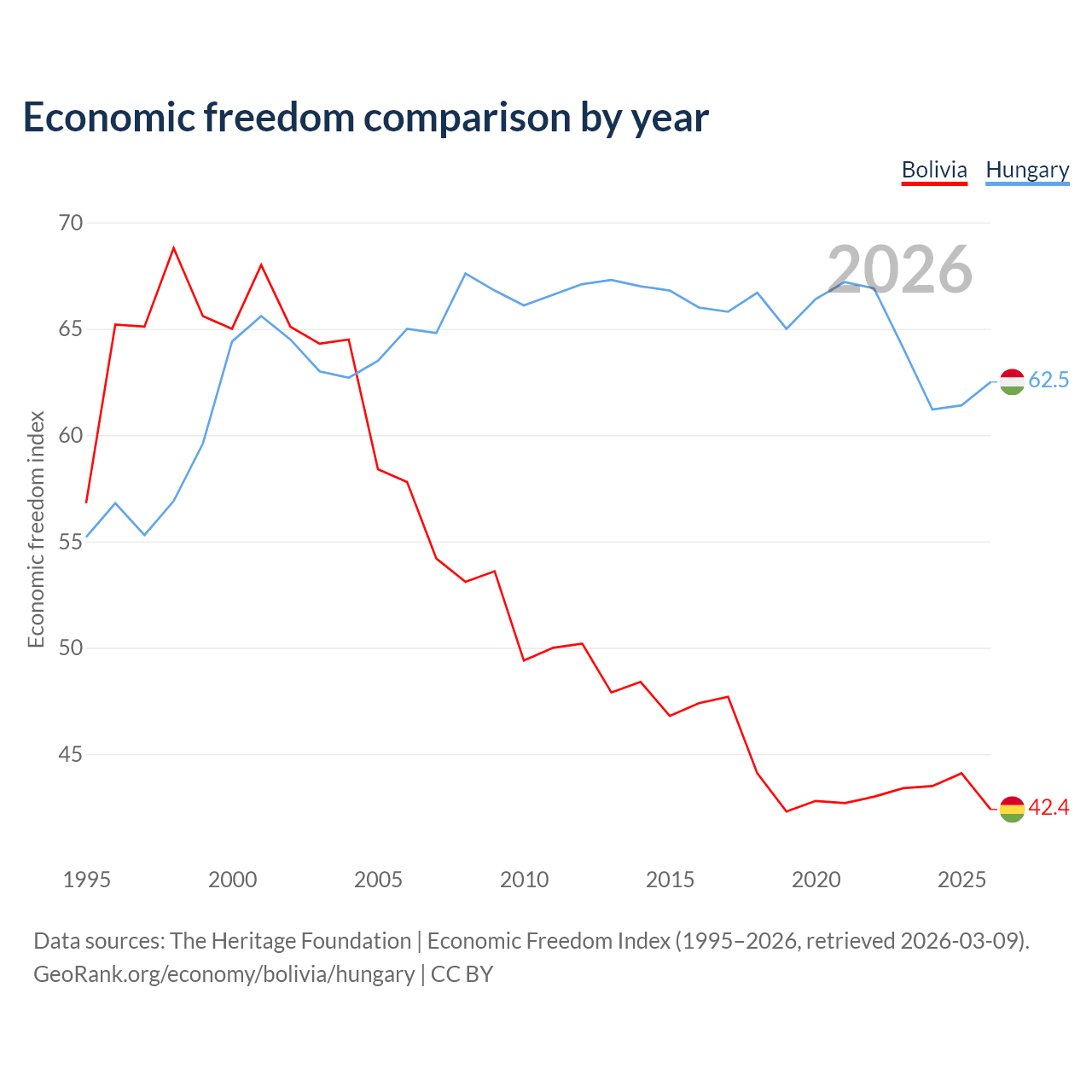 The Economic Freedom Index for Bolivia is 42.4, ranking 184/197, compared to 62.5 for Hungary, ranking 86/197. The chart above displays a comparison of annual changes in economic freedom indexes.